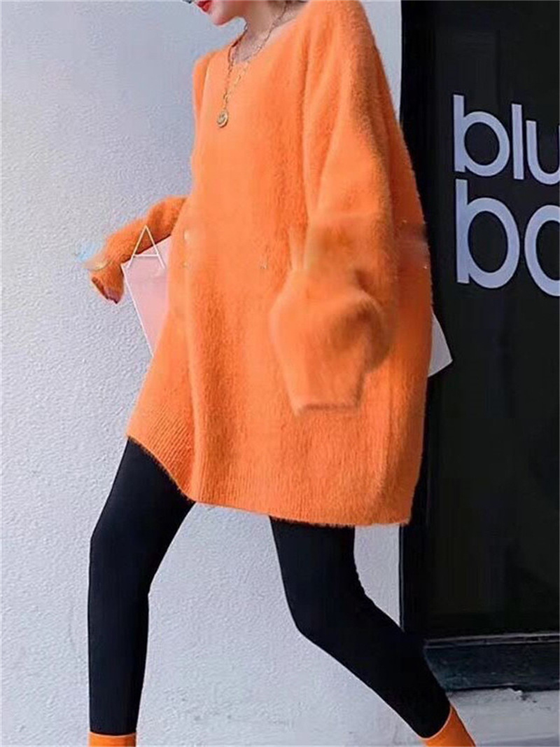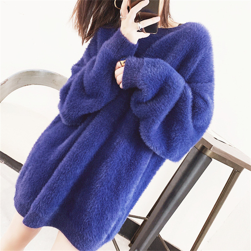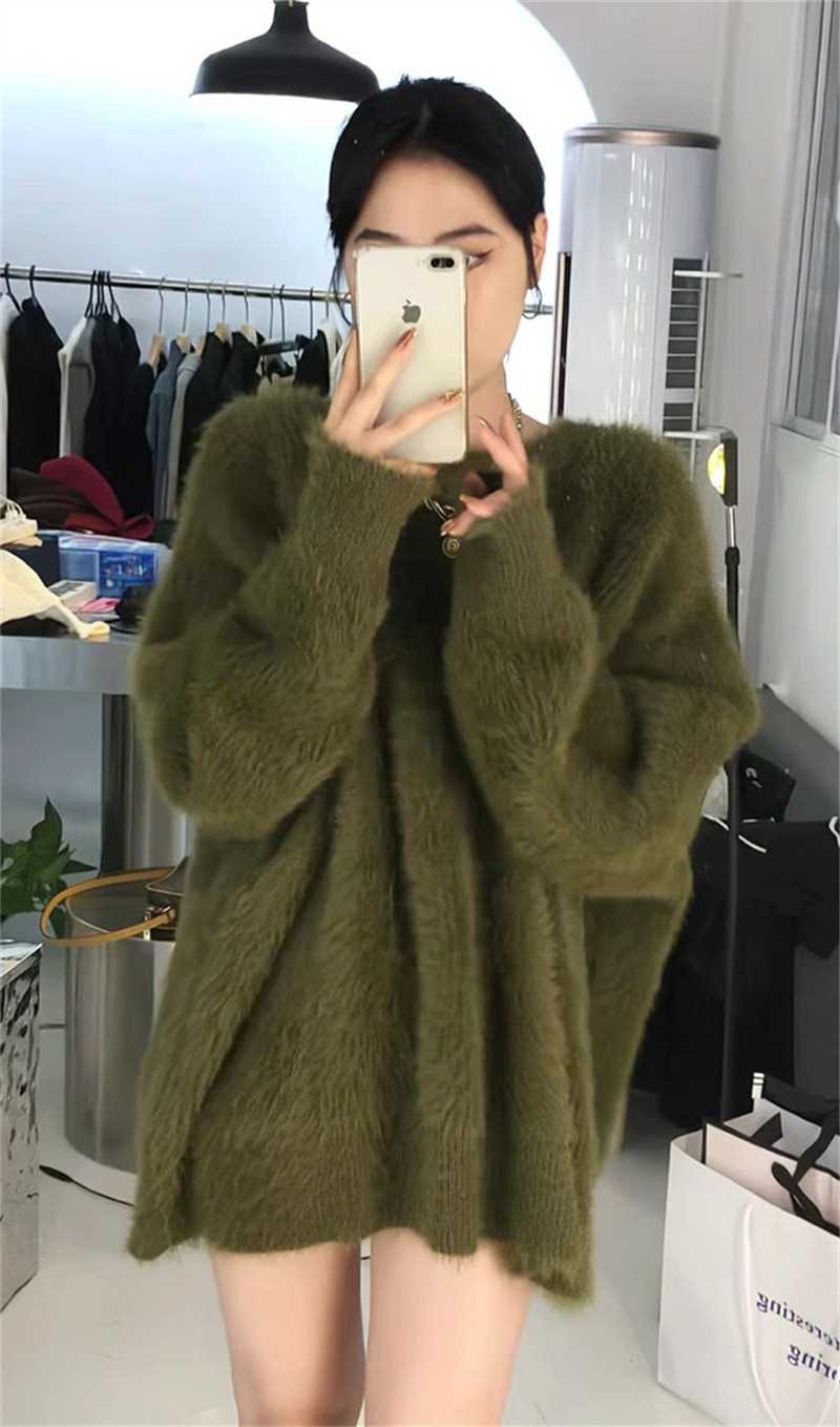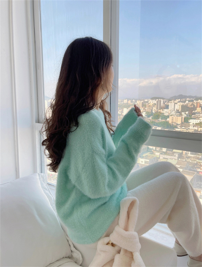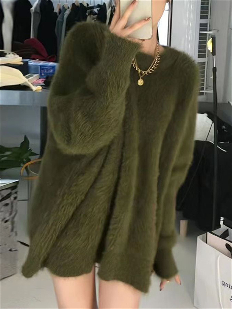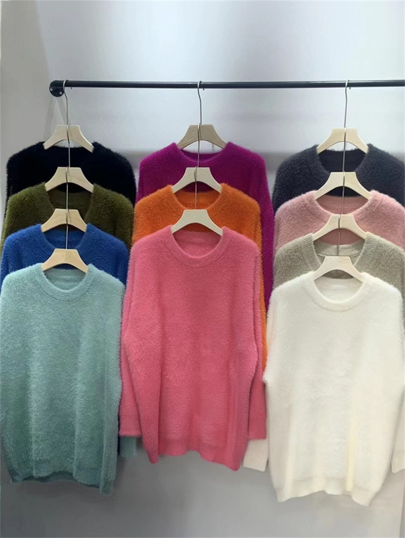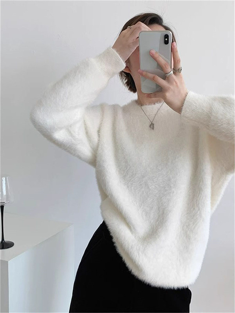 秋冬新款慵懒风圆领仿貂绒长袖套头毛衣女宽松加厚纯色软糯针织衫