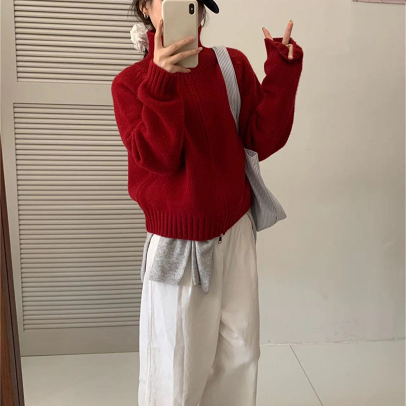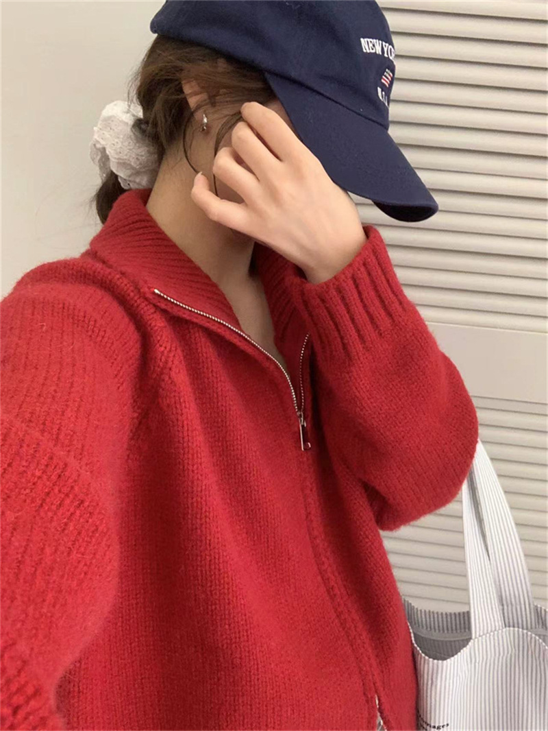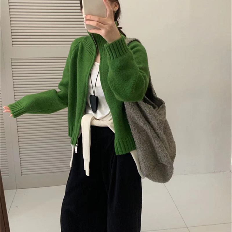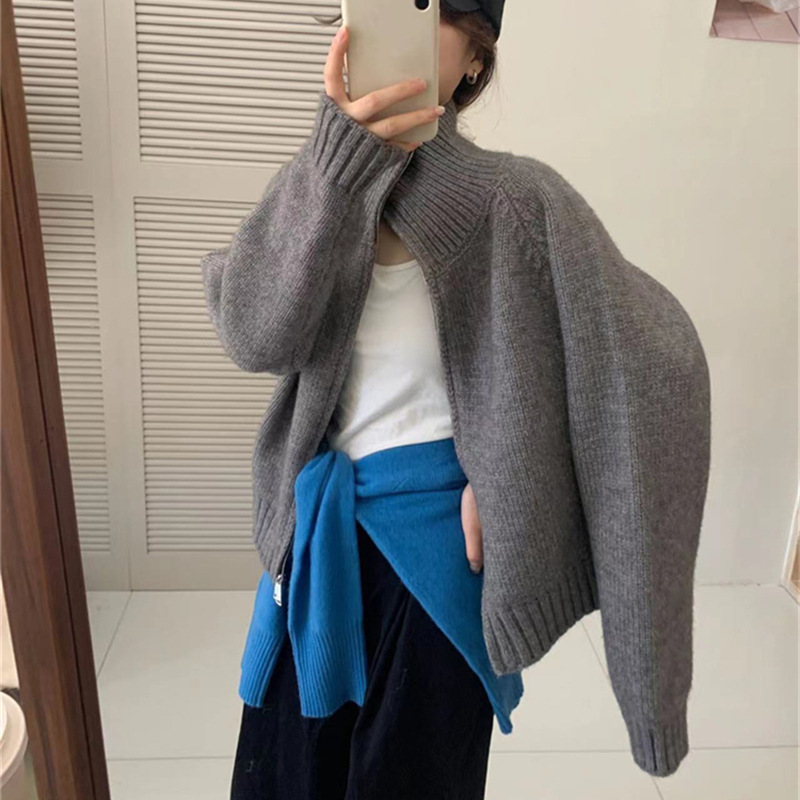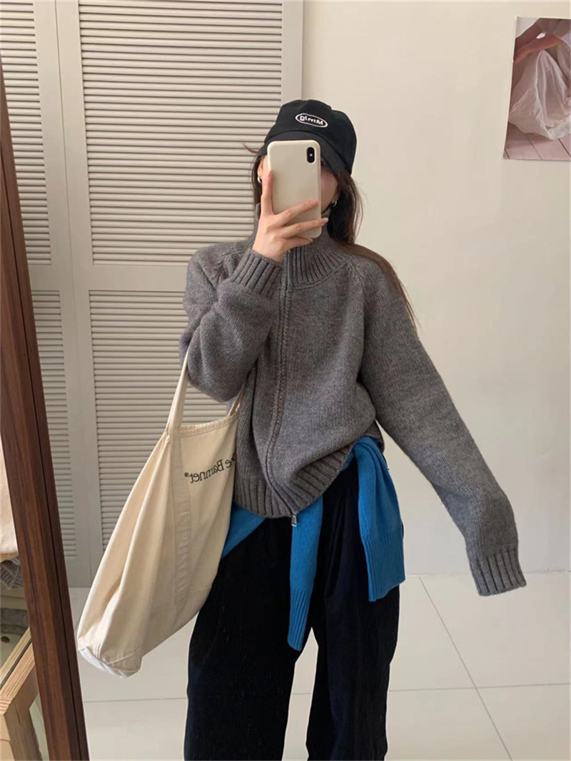 韩系慵懒风纯色双拉链毛衣外套女秋冬季新款宽松简约立领针织开衫