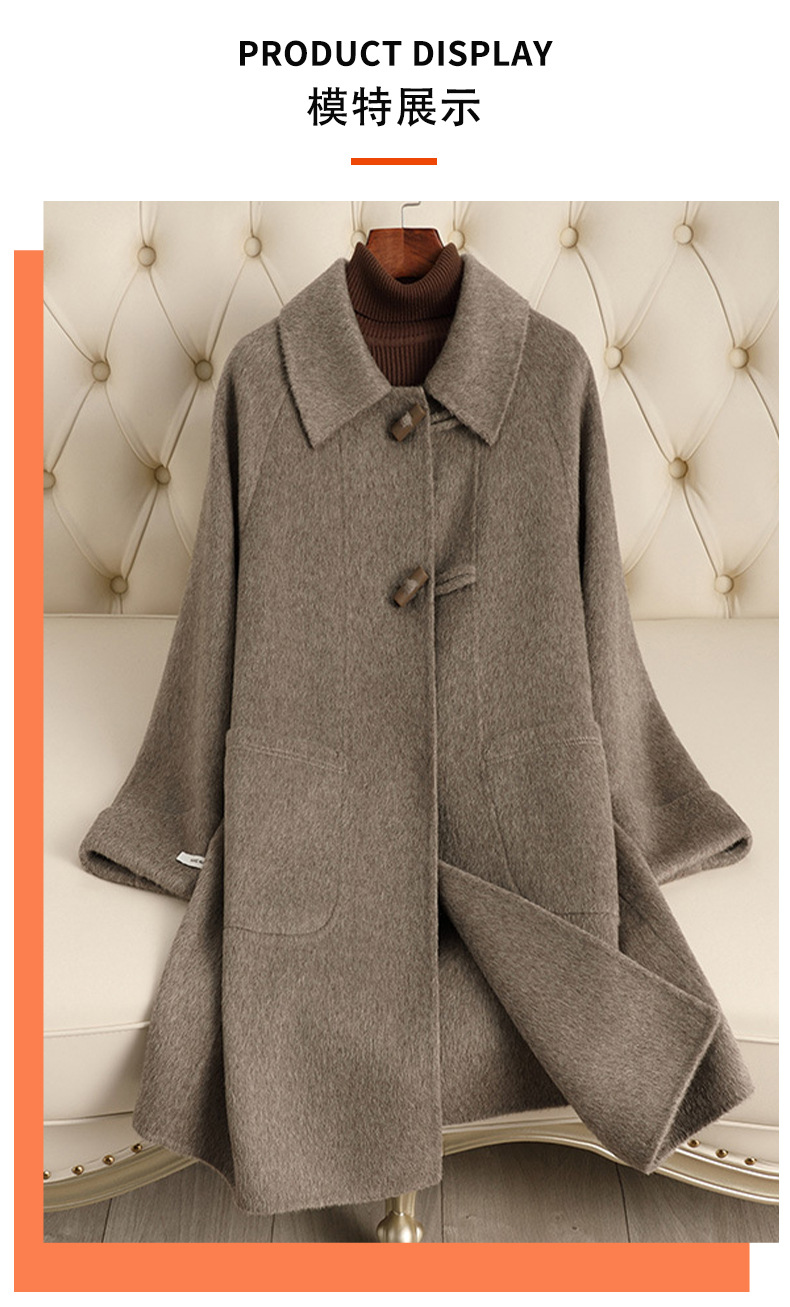 加工定制双面羊绒大衣女中长款韩版宽松牛角扣毛呢外套厂家大翻领