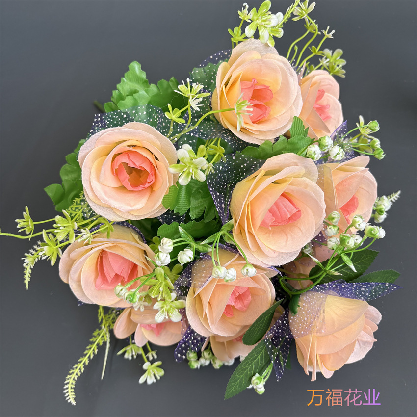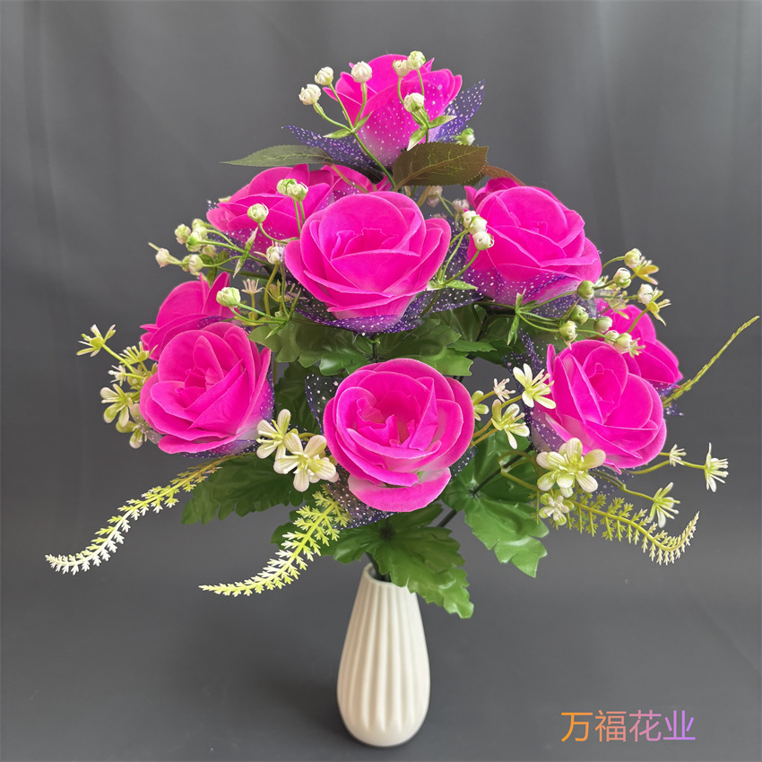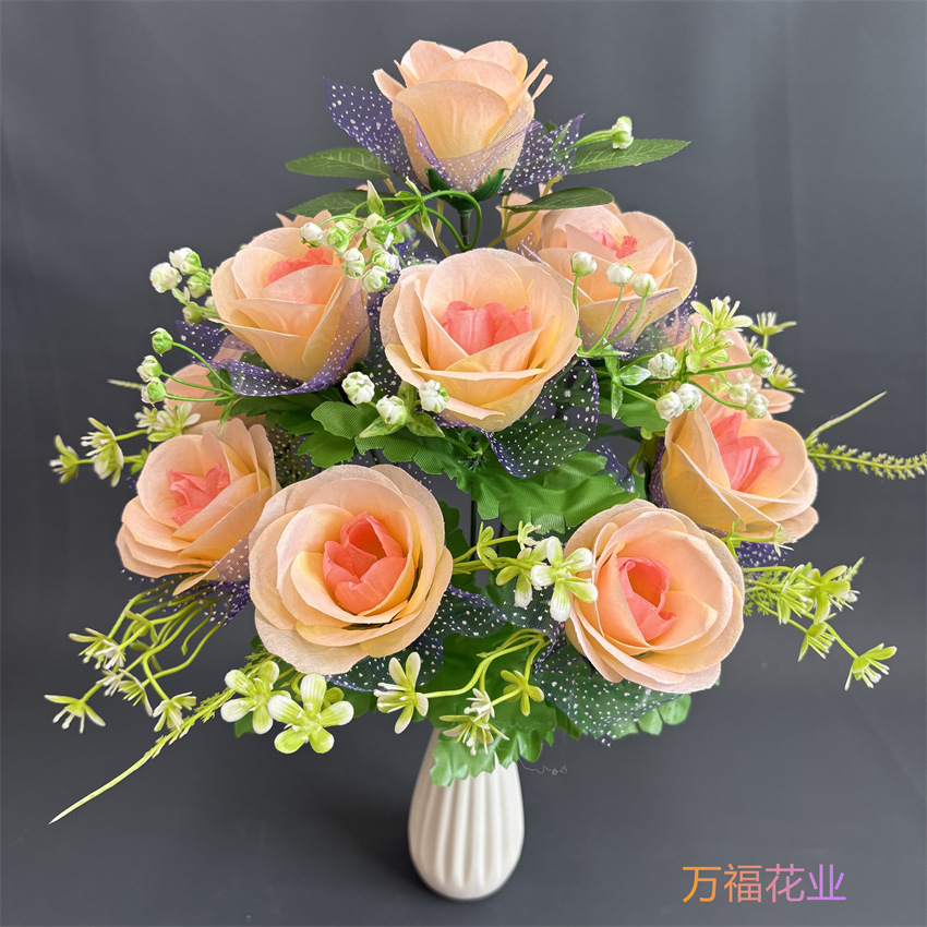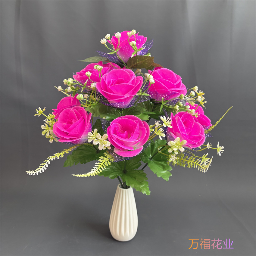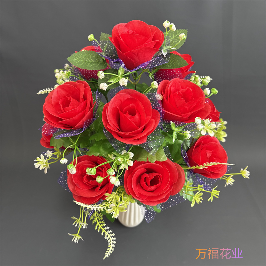 纱网仿真玫瑰假花12头玫瑰花束塑料花装饰摆件清明模拟永生花批发