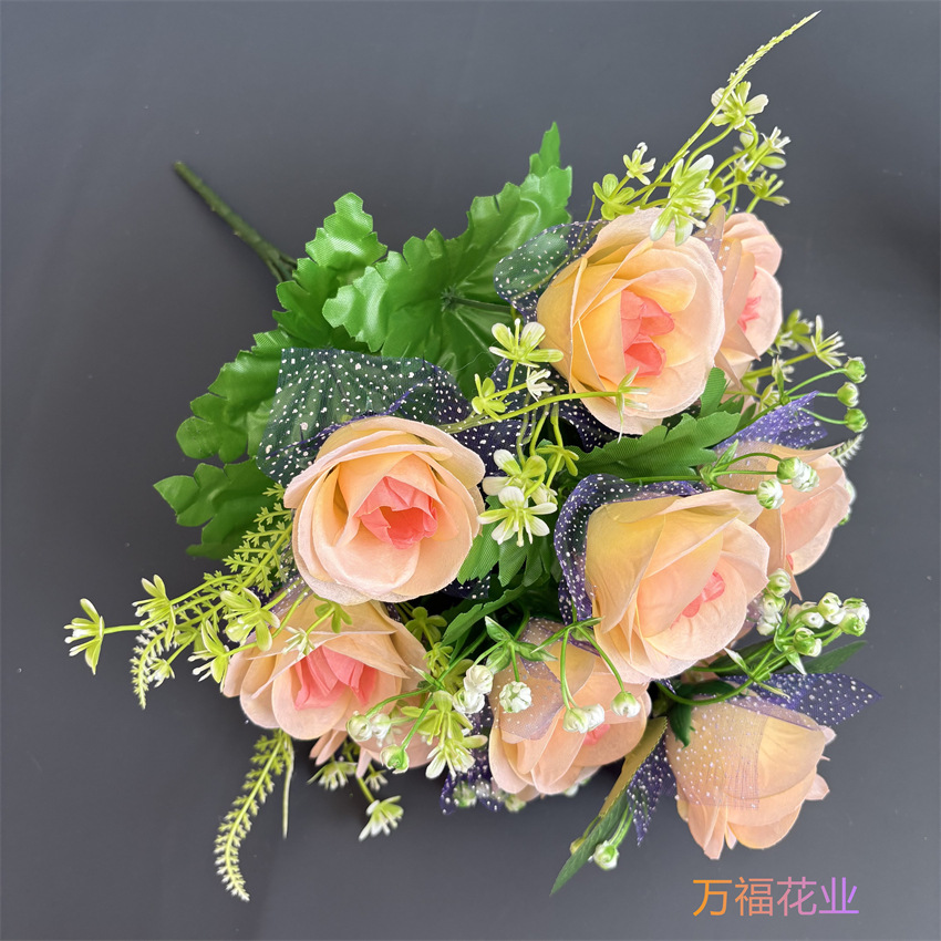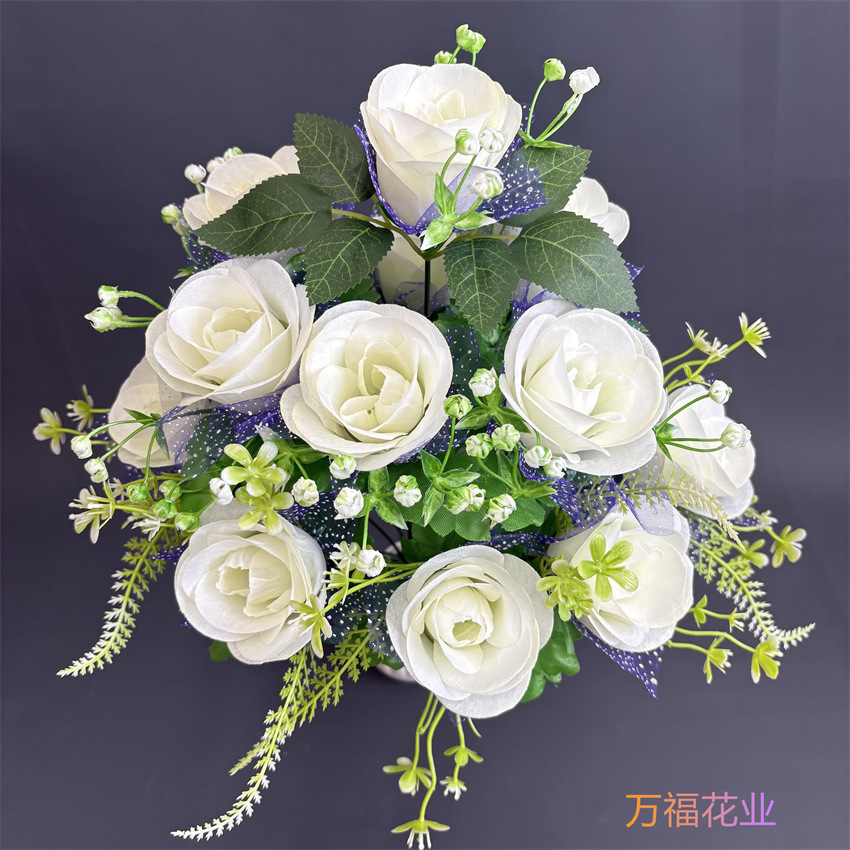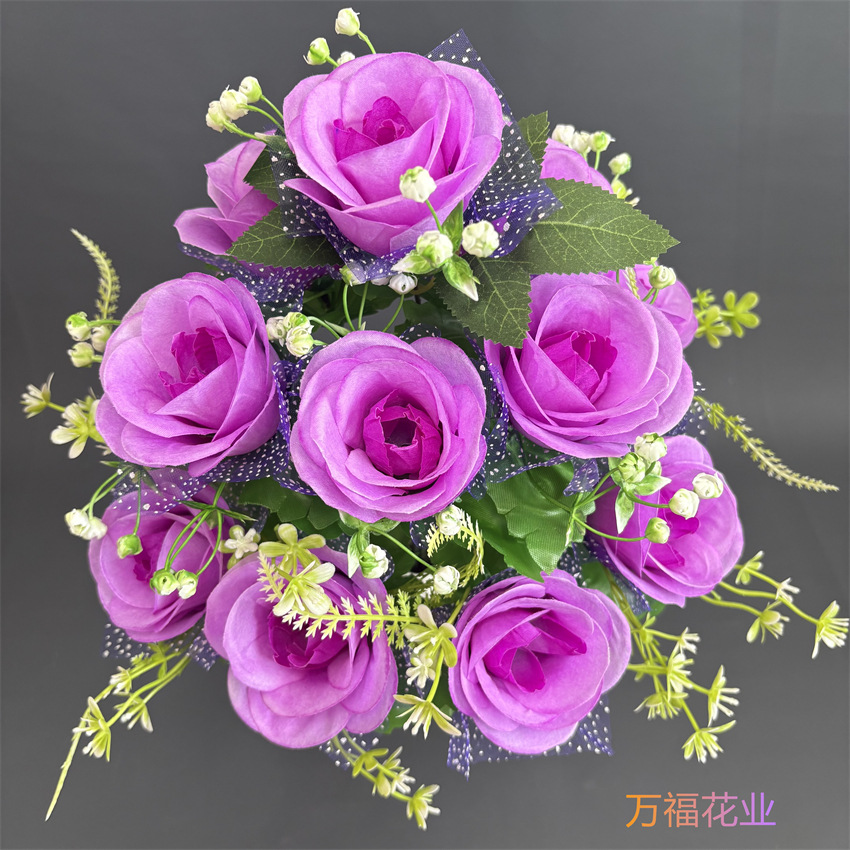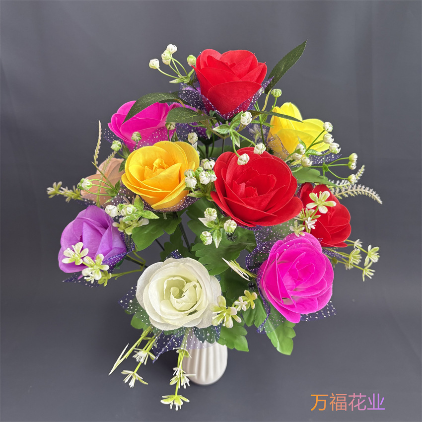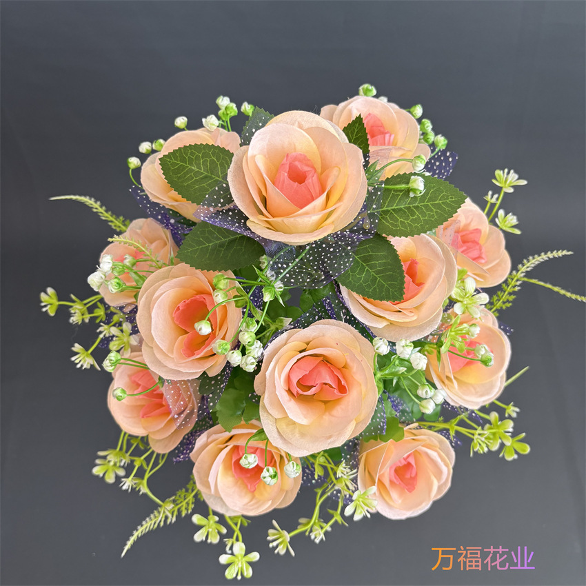 纱网仿真玫瑰假花12头玫瑰花束塑料花装饰摆件清明模拟永生花批发