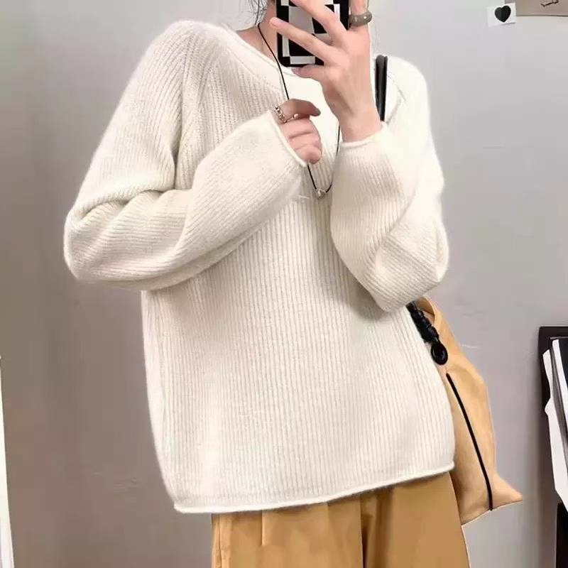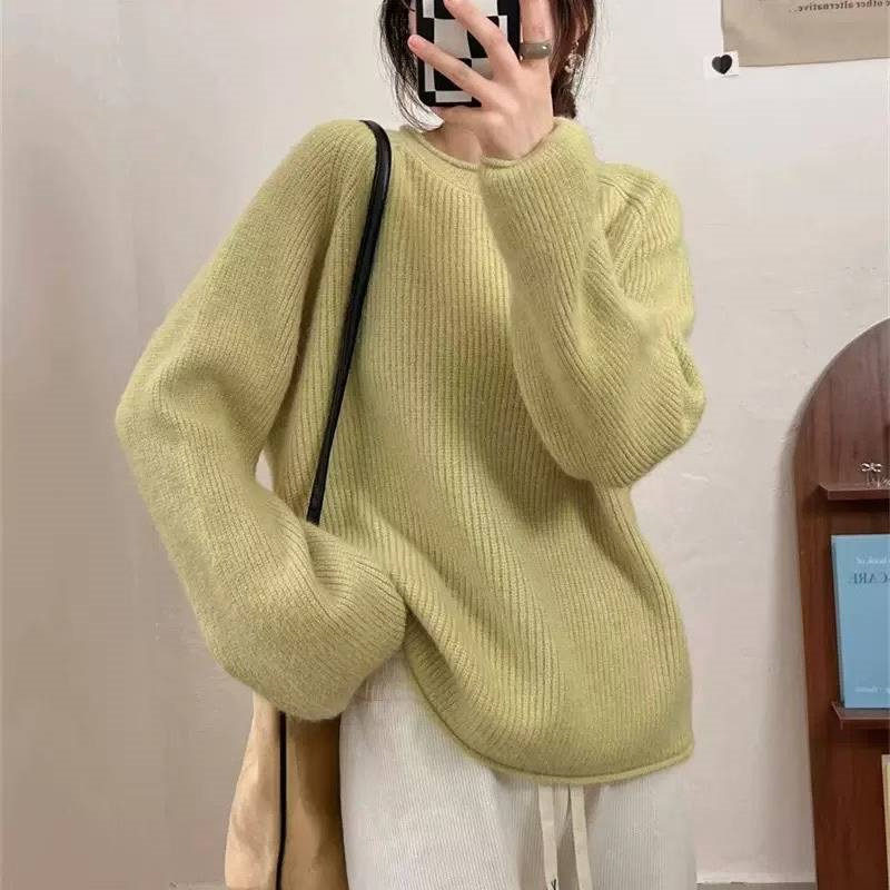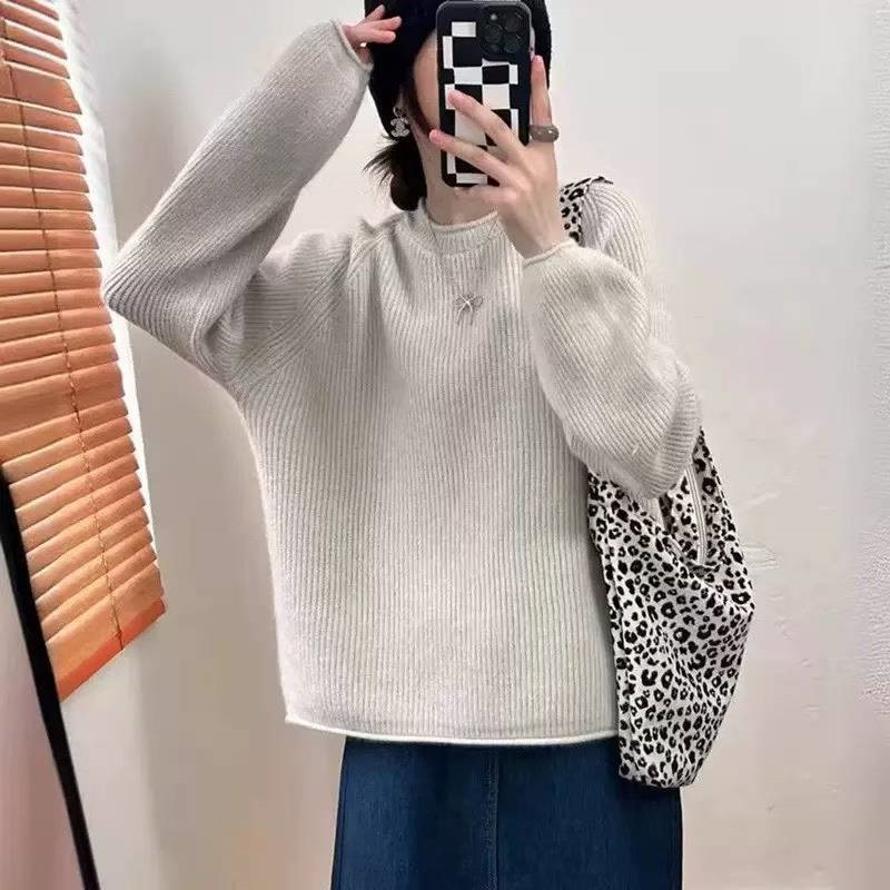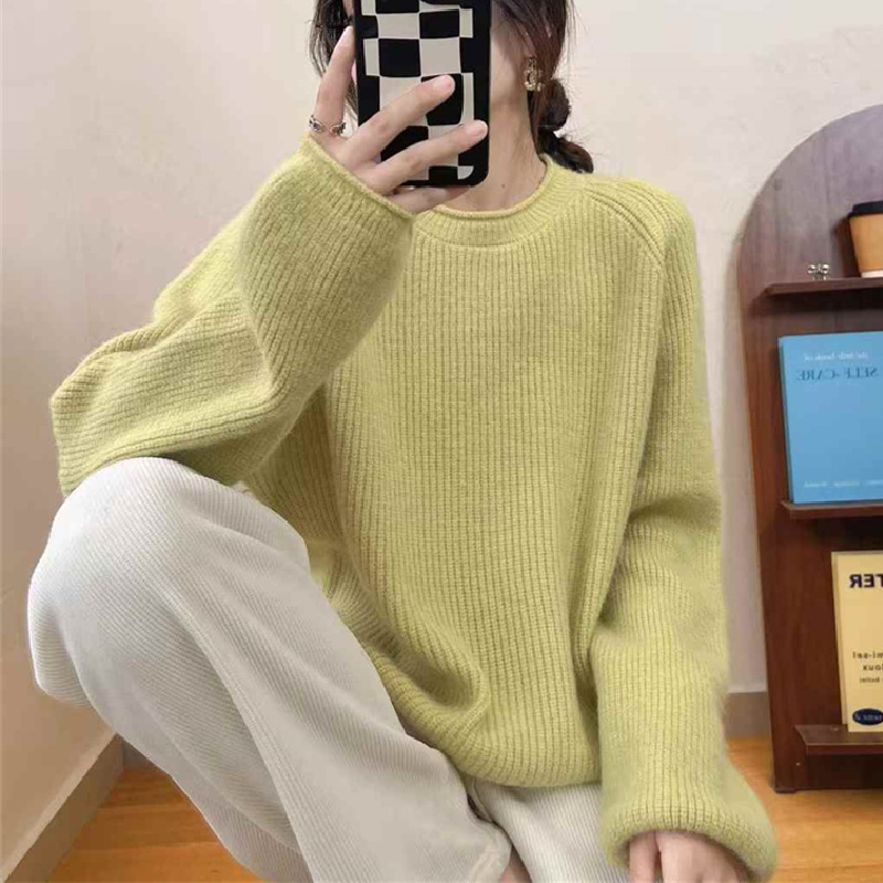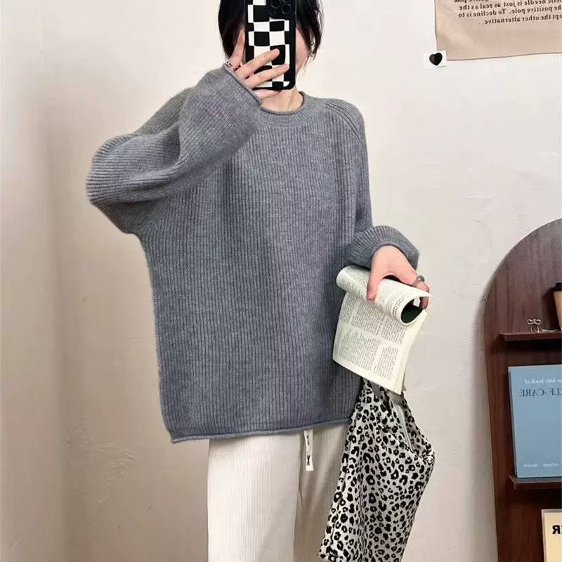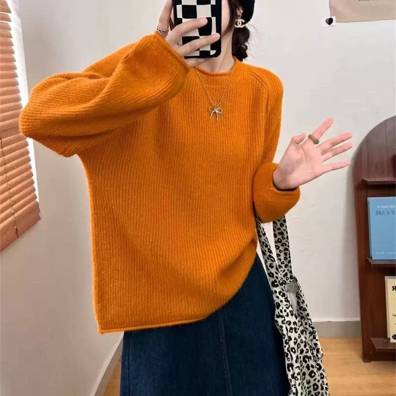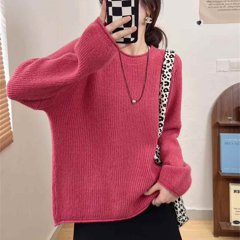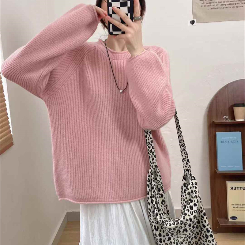 韩系温柔软糯卷边圆领套头毛衣女秋冬新款宽松慵懒风针织衫上衣女