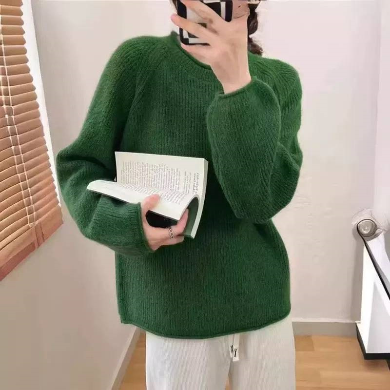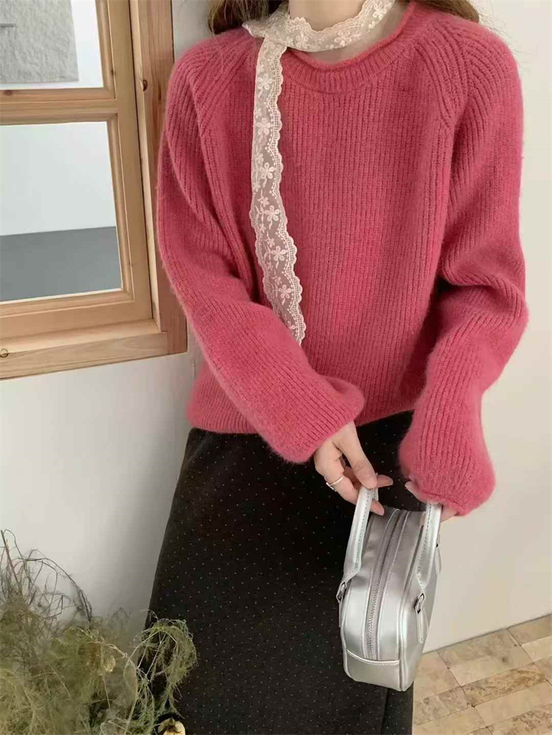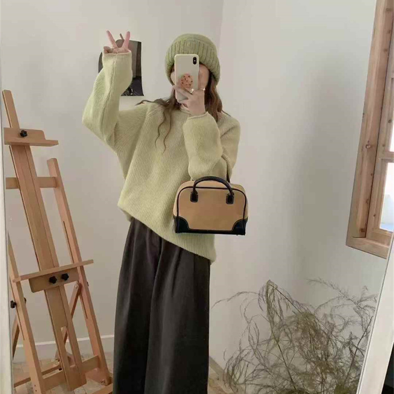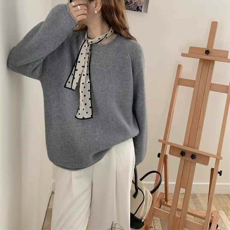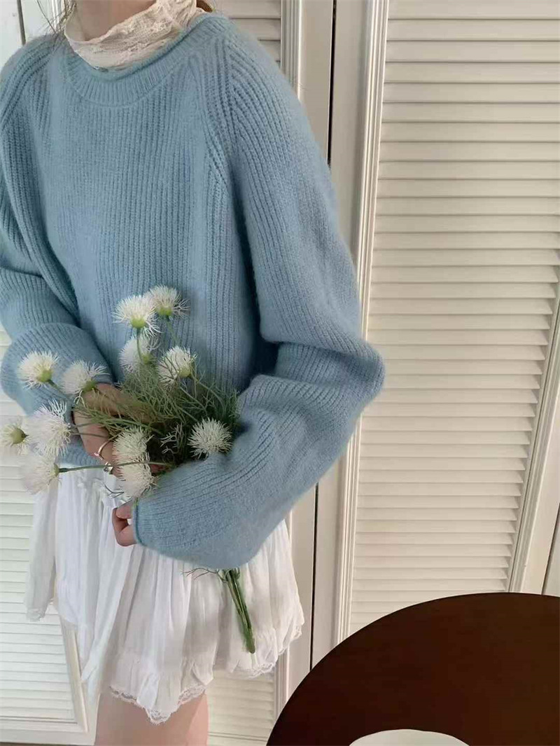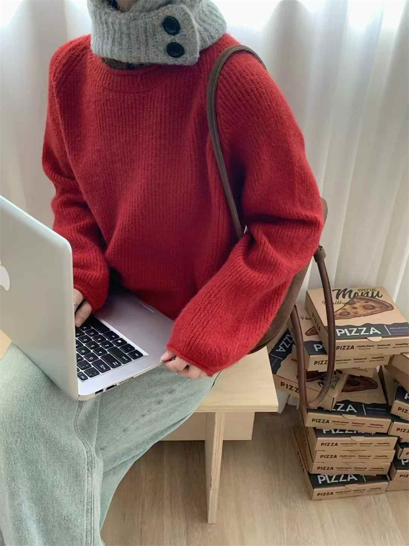 韩系温柔软糯卷边圆领套头毛衣女秋冬新款宽松慵懒风针织衫上衣女