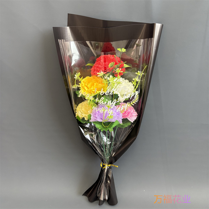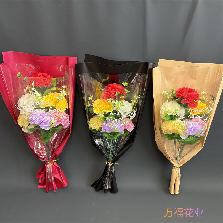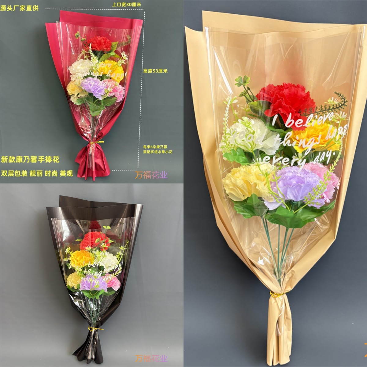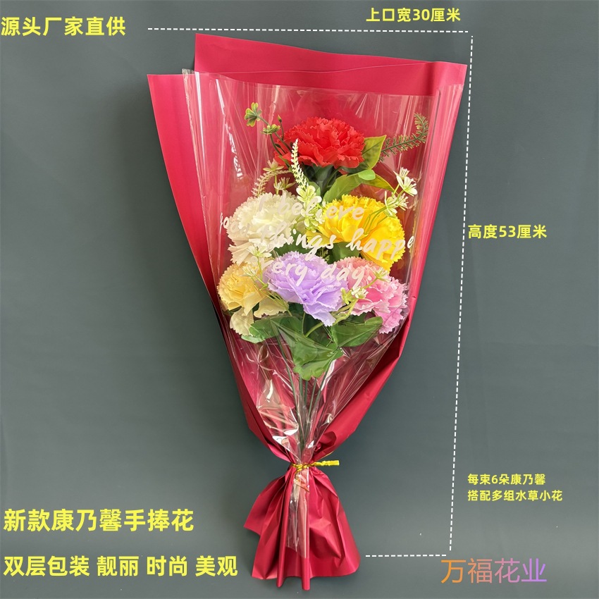 6头新康乃馨手捧花 每朵花多达6层花片组成 花朵更饱满密实 每束配2款共4组水草搭配彩色康乃馨 外加双层仿鲜花包装材料 整体非常新颖 靓丽 美观。