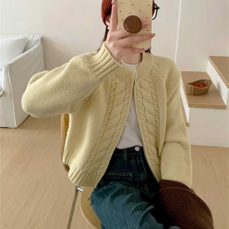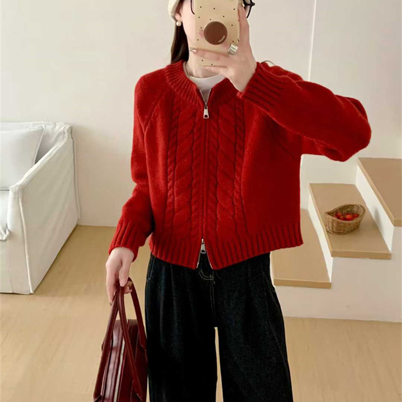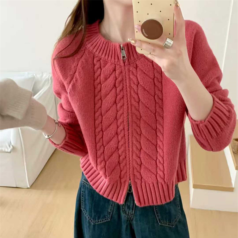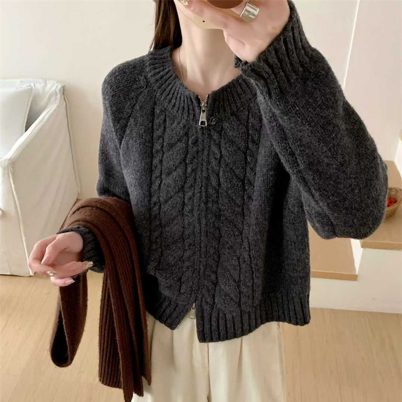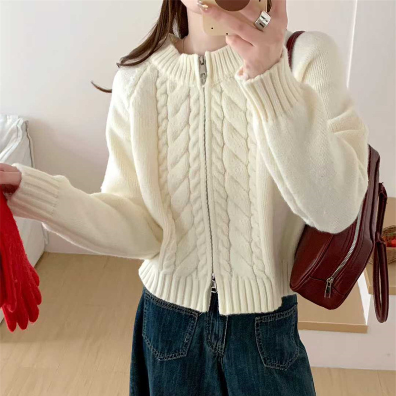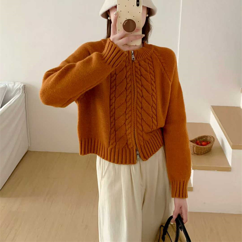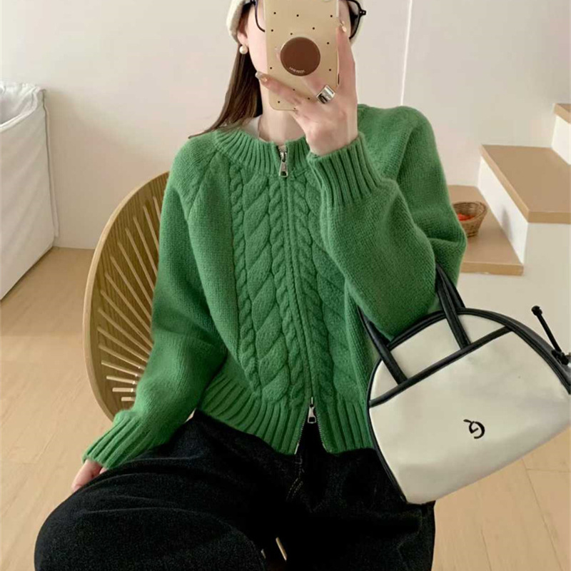 复古麻花纯色拉链毛衣外套女秋冬新款小个子软糯针织圆领短款开衫