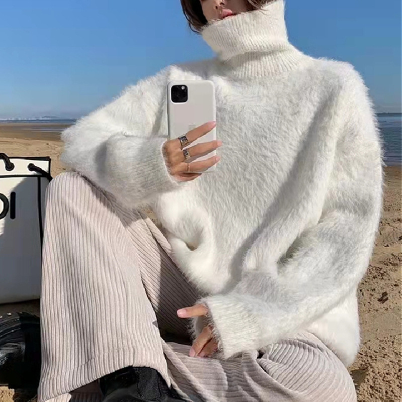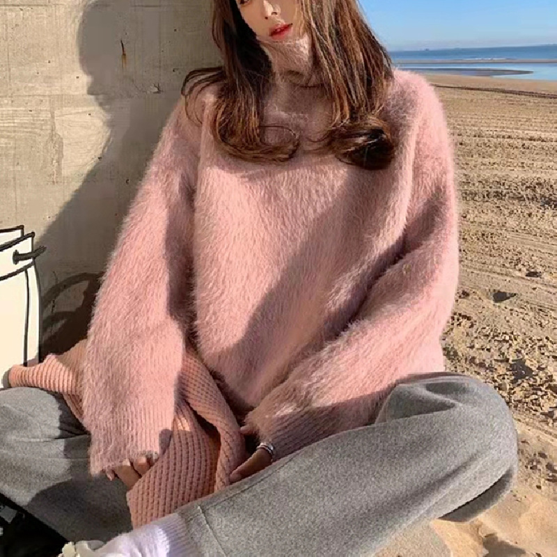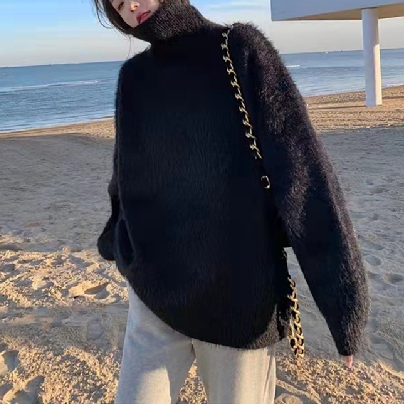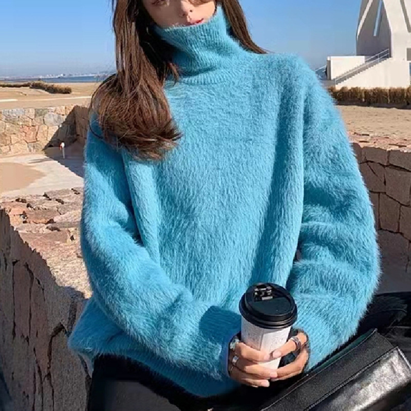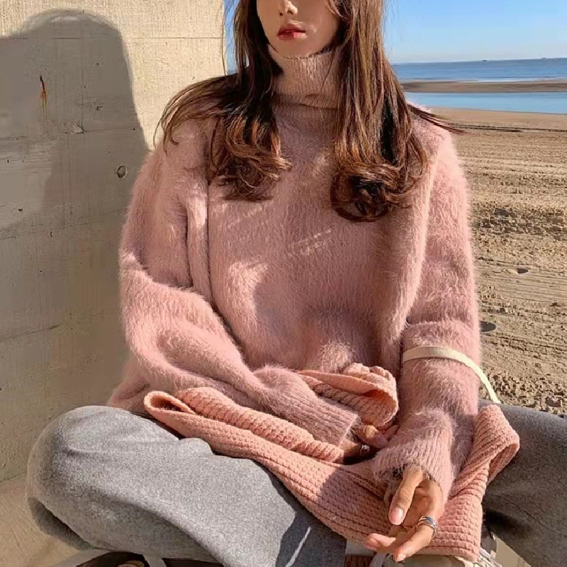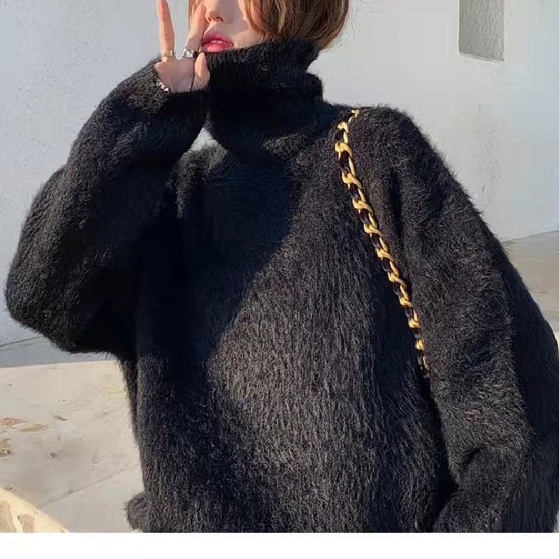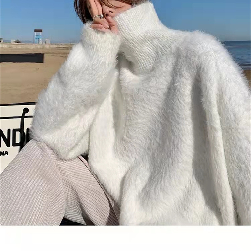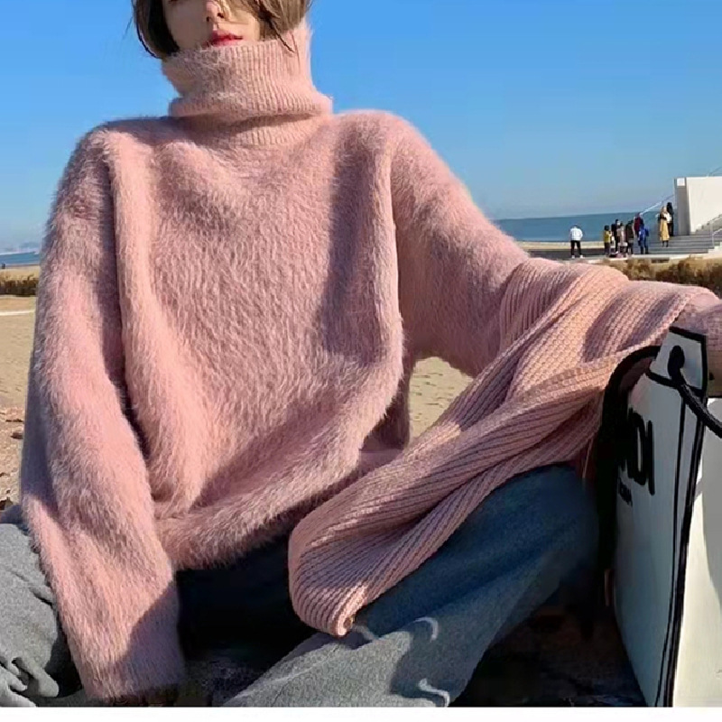 韩系纯色高级感仿貂绒高领毛衣秋冬季新款慵懒风宽松针织套头衫女