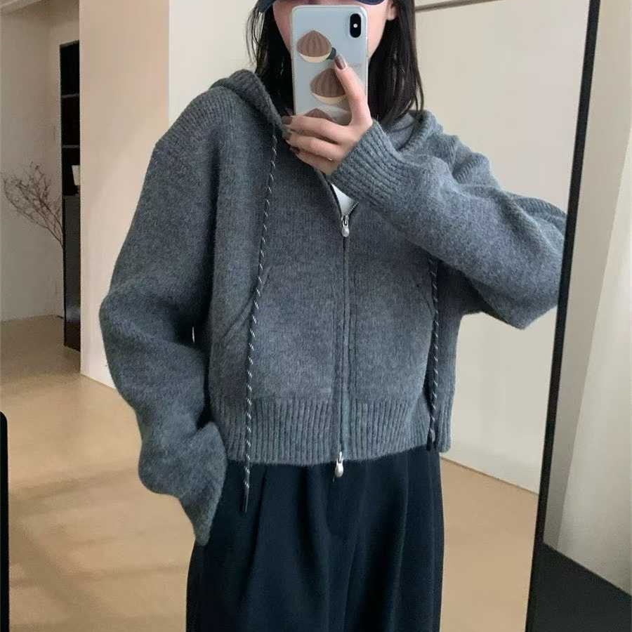 韩系穿搭休闲设计感抽绳拉链连帽毛衣开衫女秋冬加厚短款针织外套