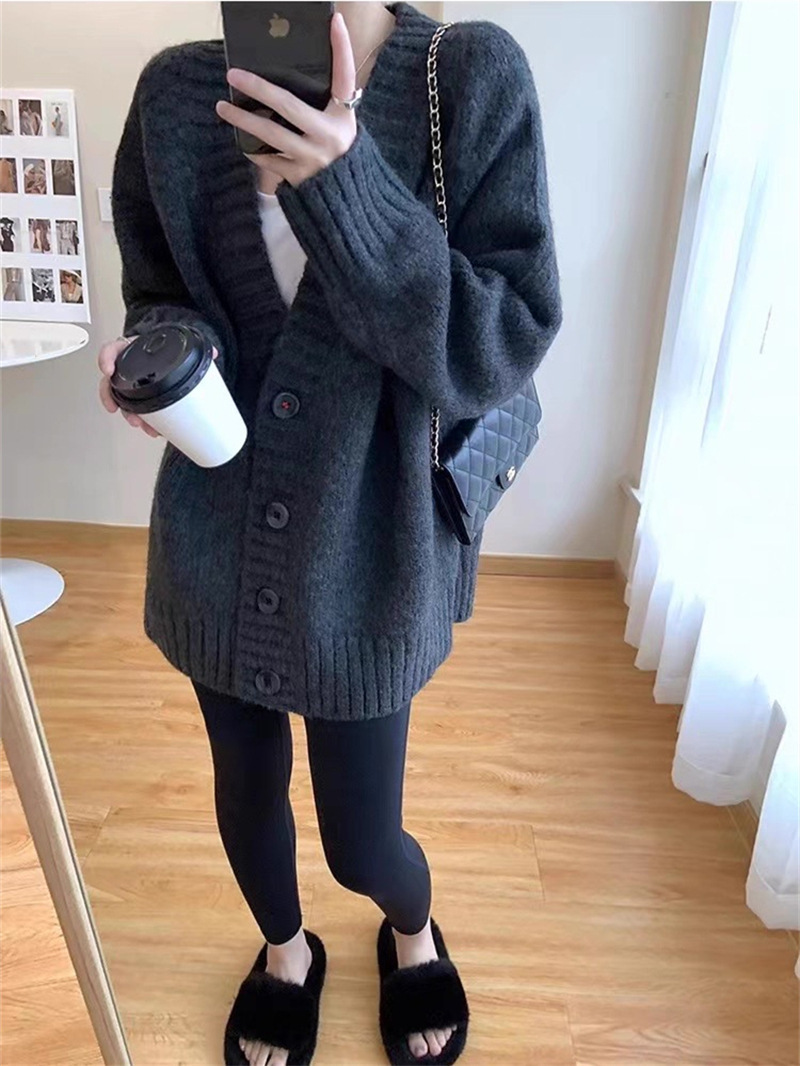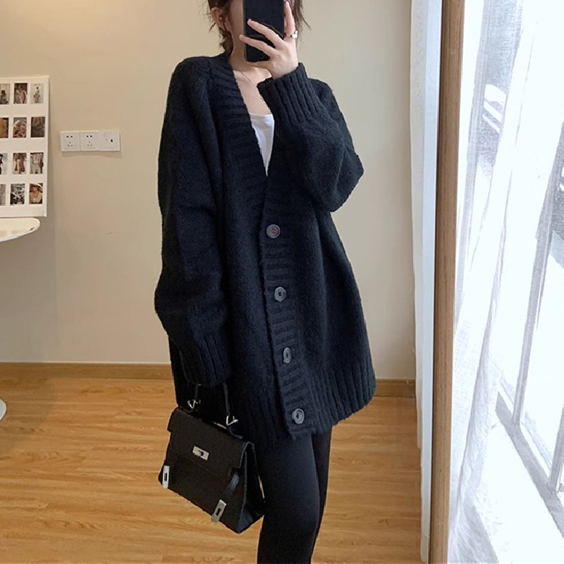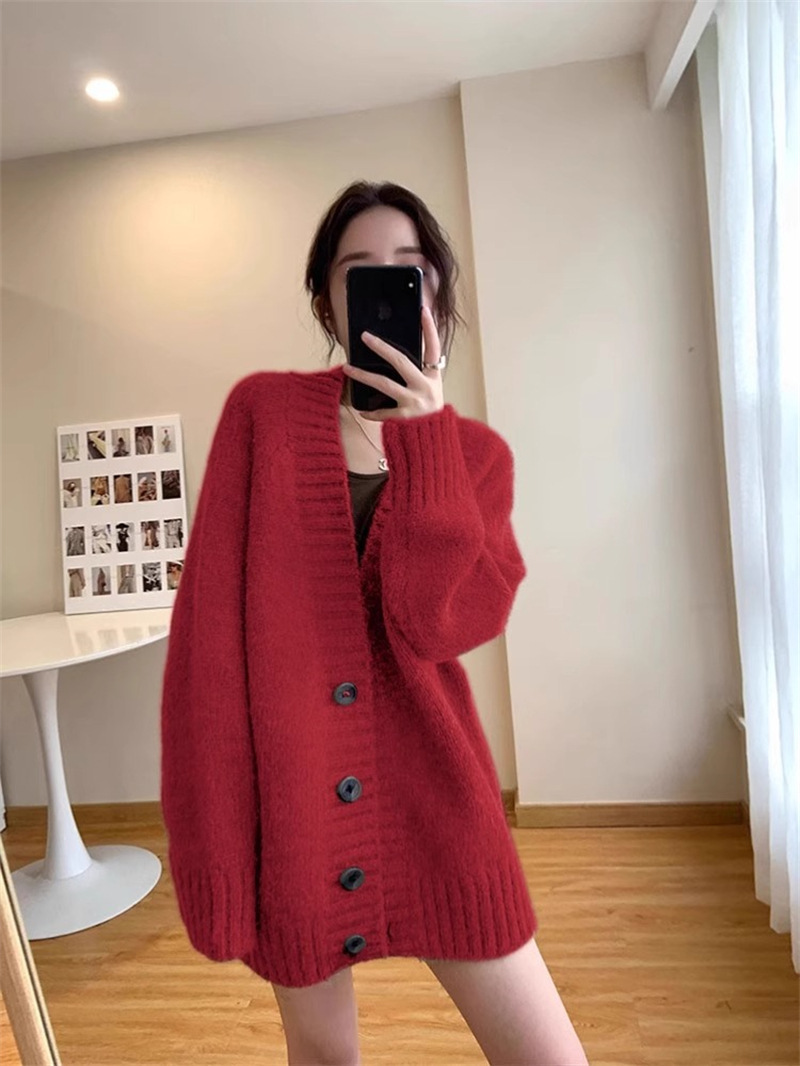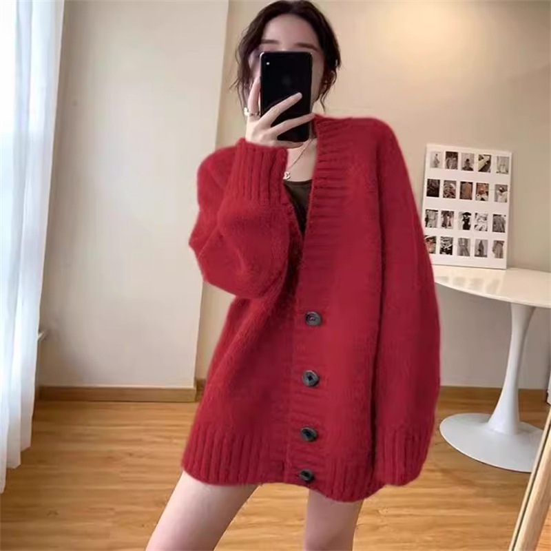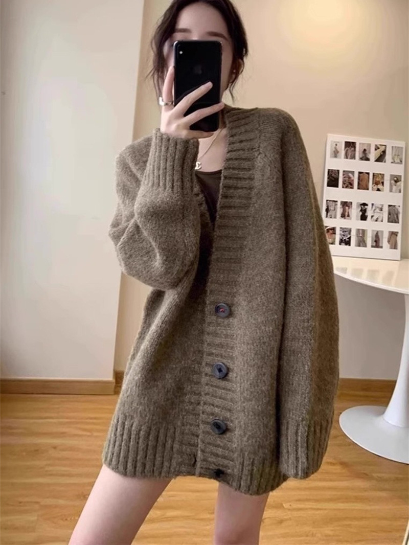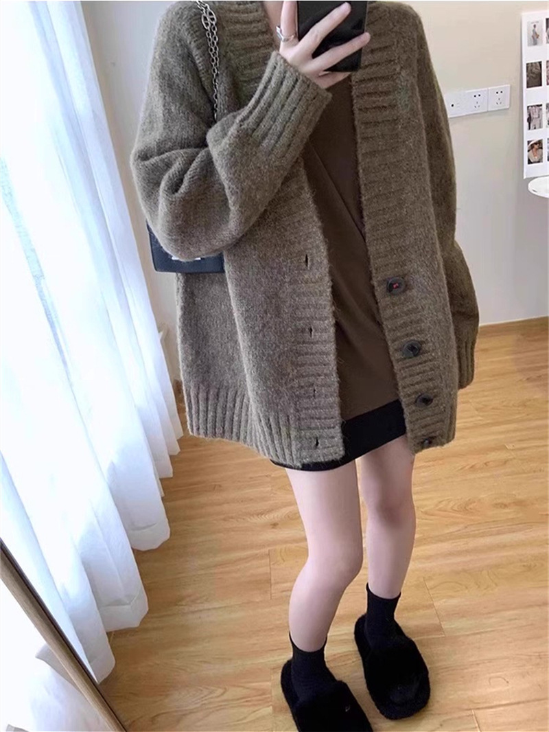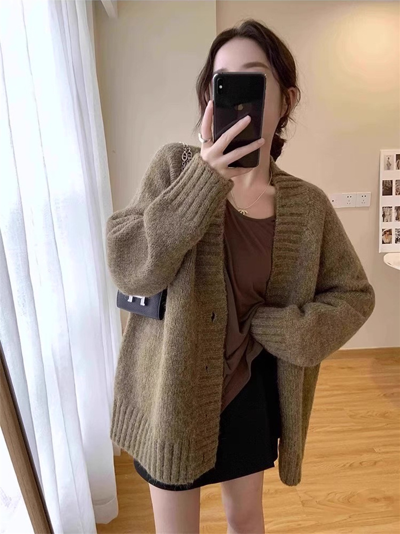 慵懒风复古宽松V领毛衣外套女秋冬季韩版轻熟风外搭长袖针织开衫