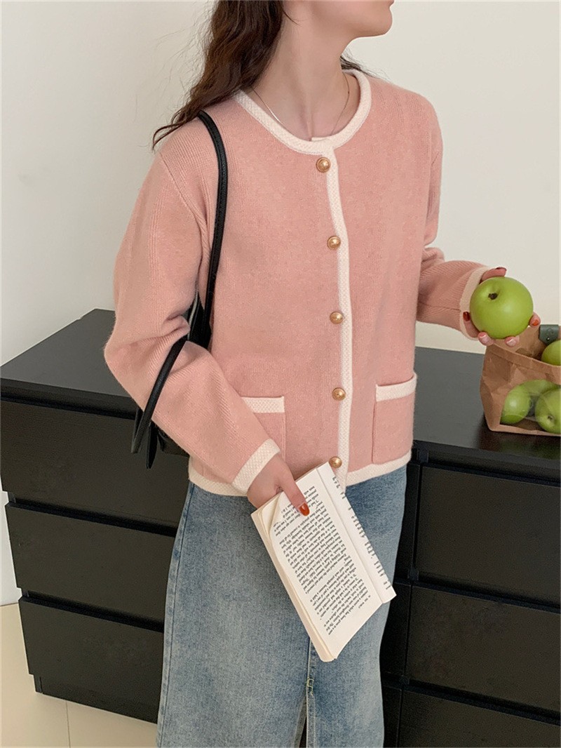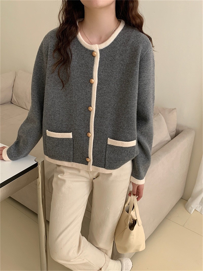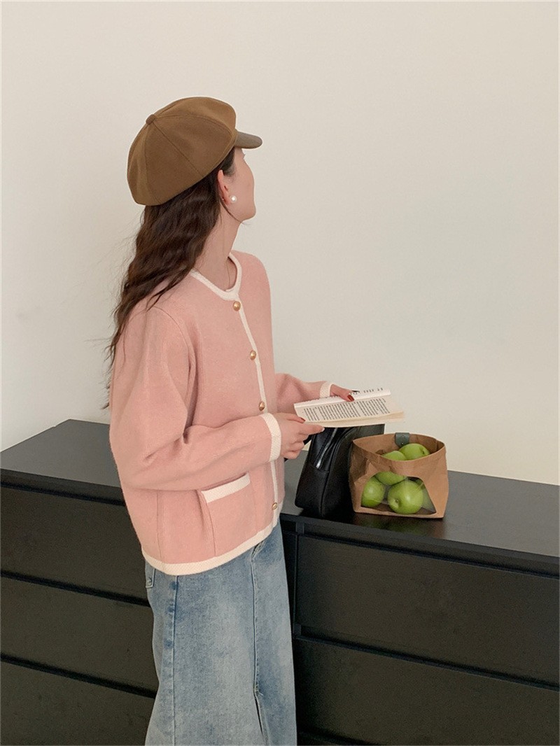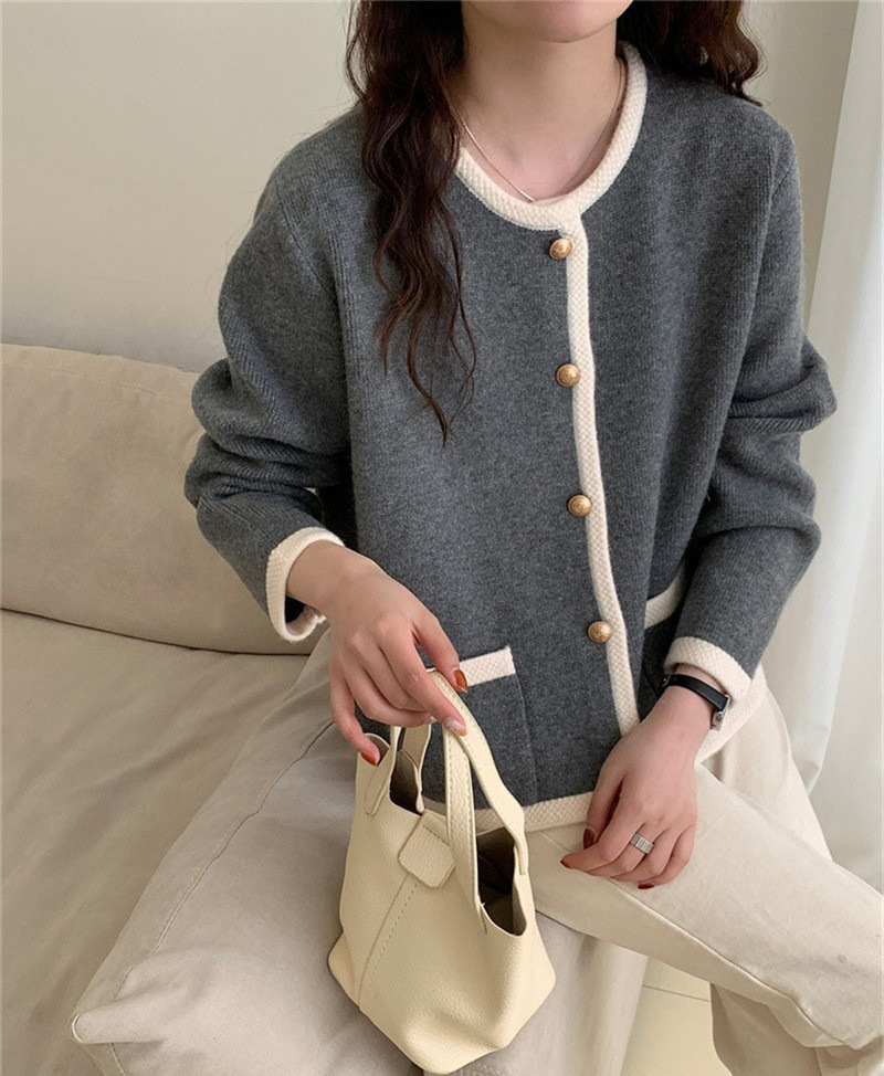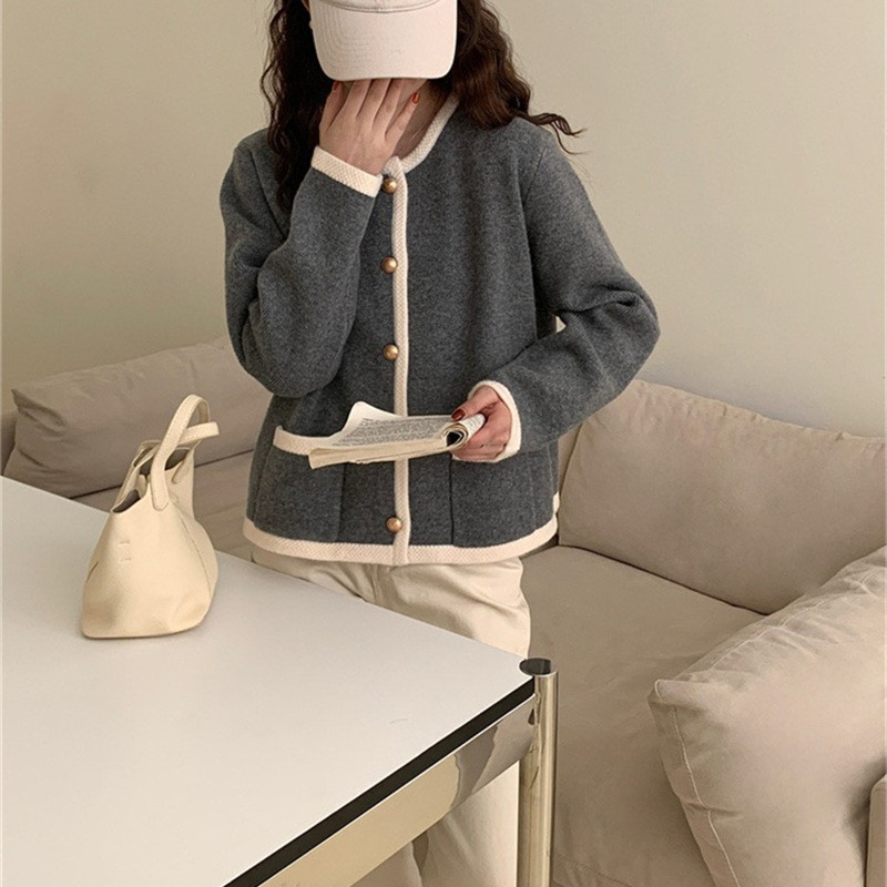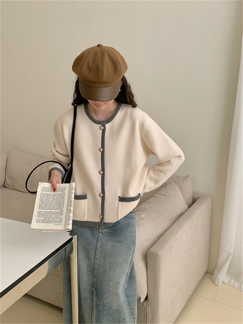 拼色圆领小香风针织开衫女秋冬新款韩版高级感休闲单排扣毛衣外套