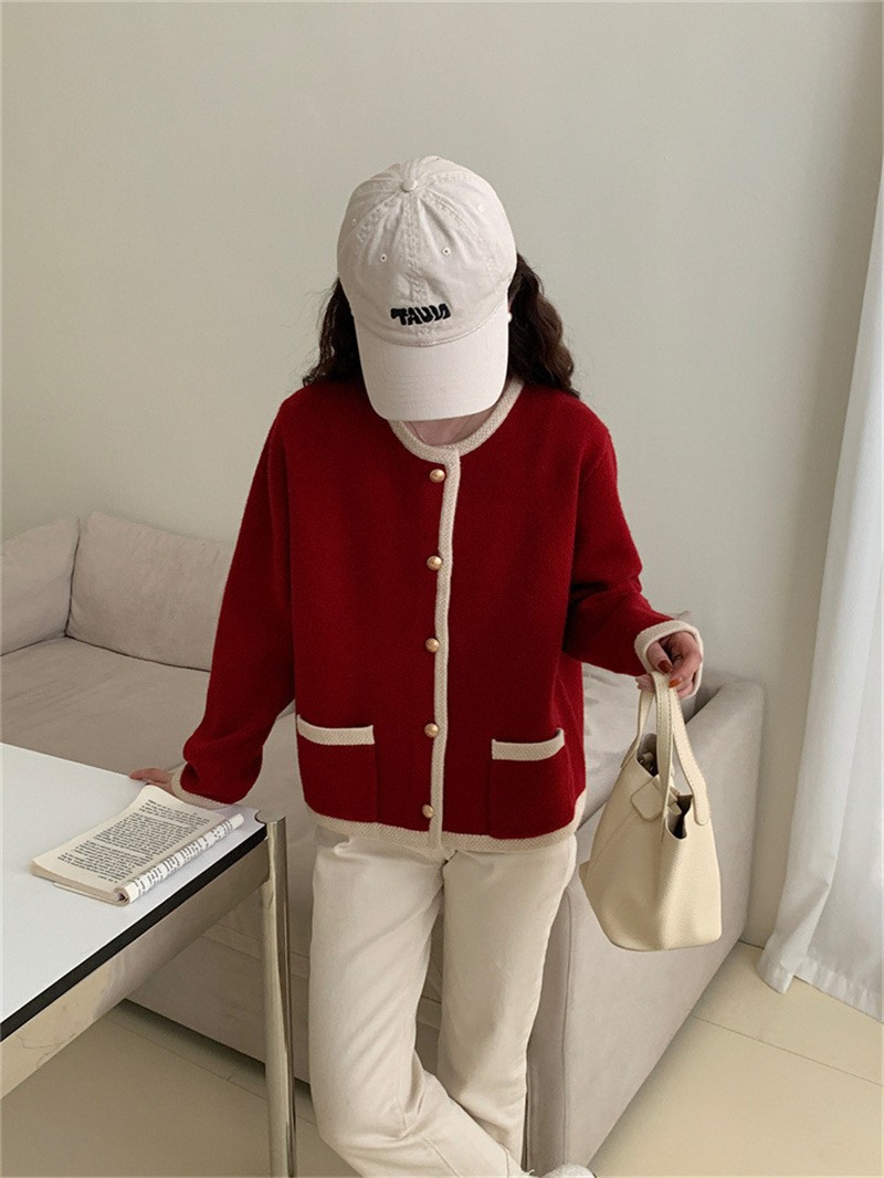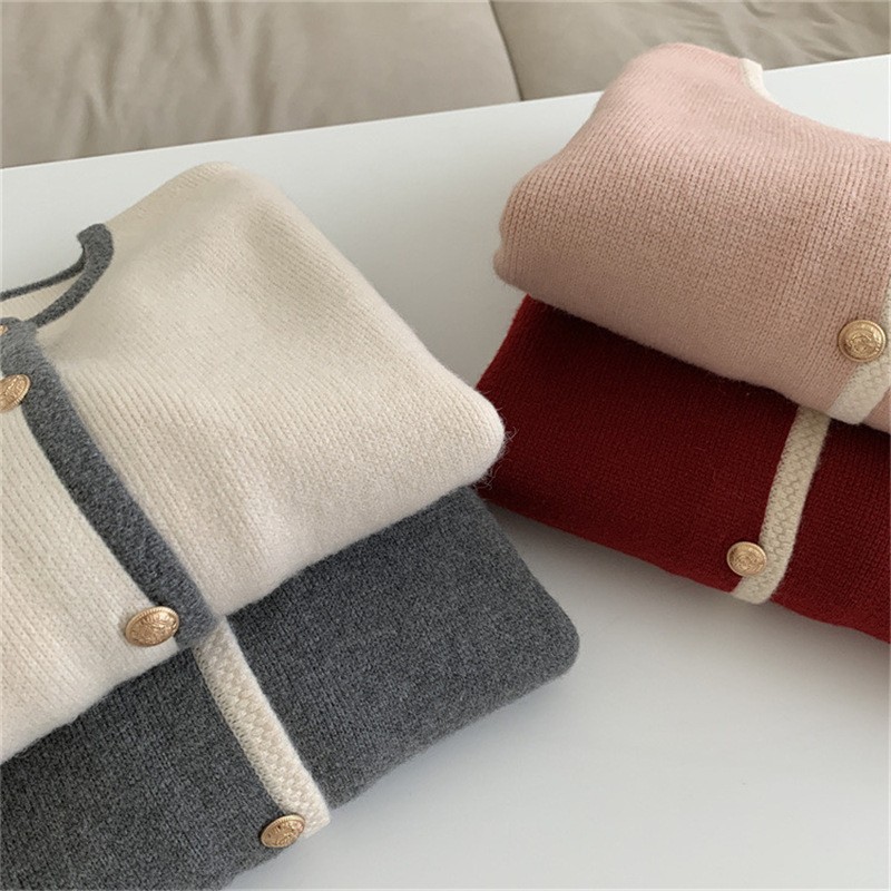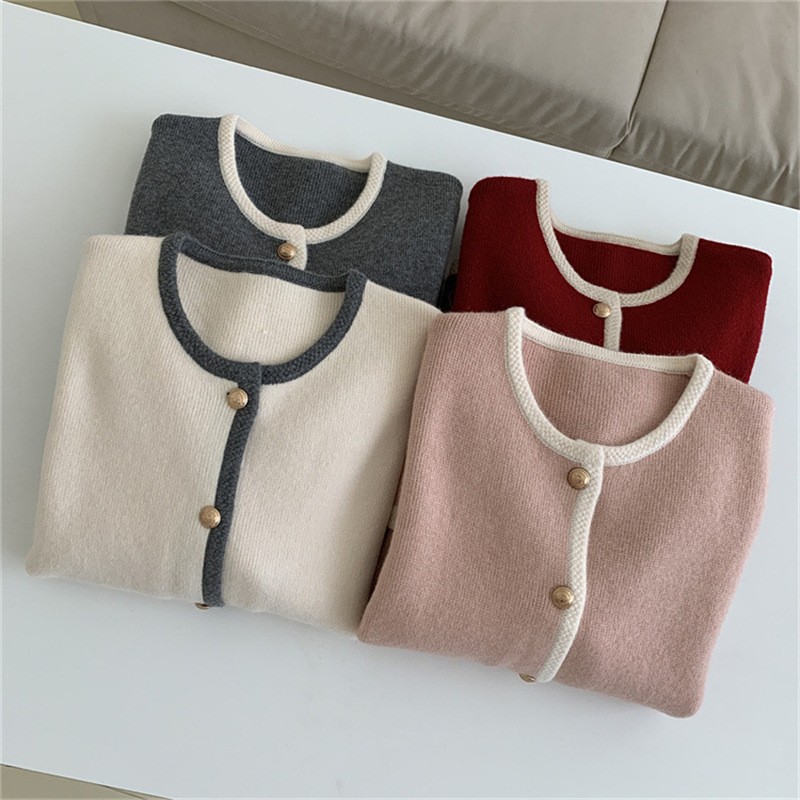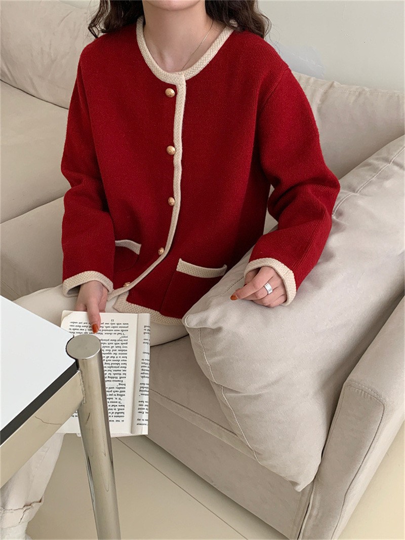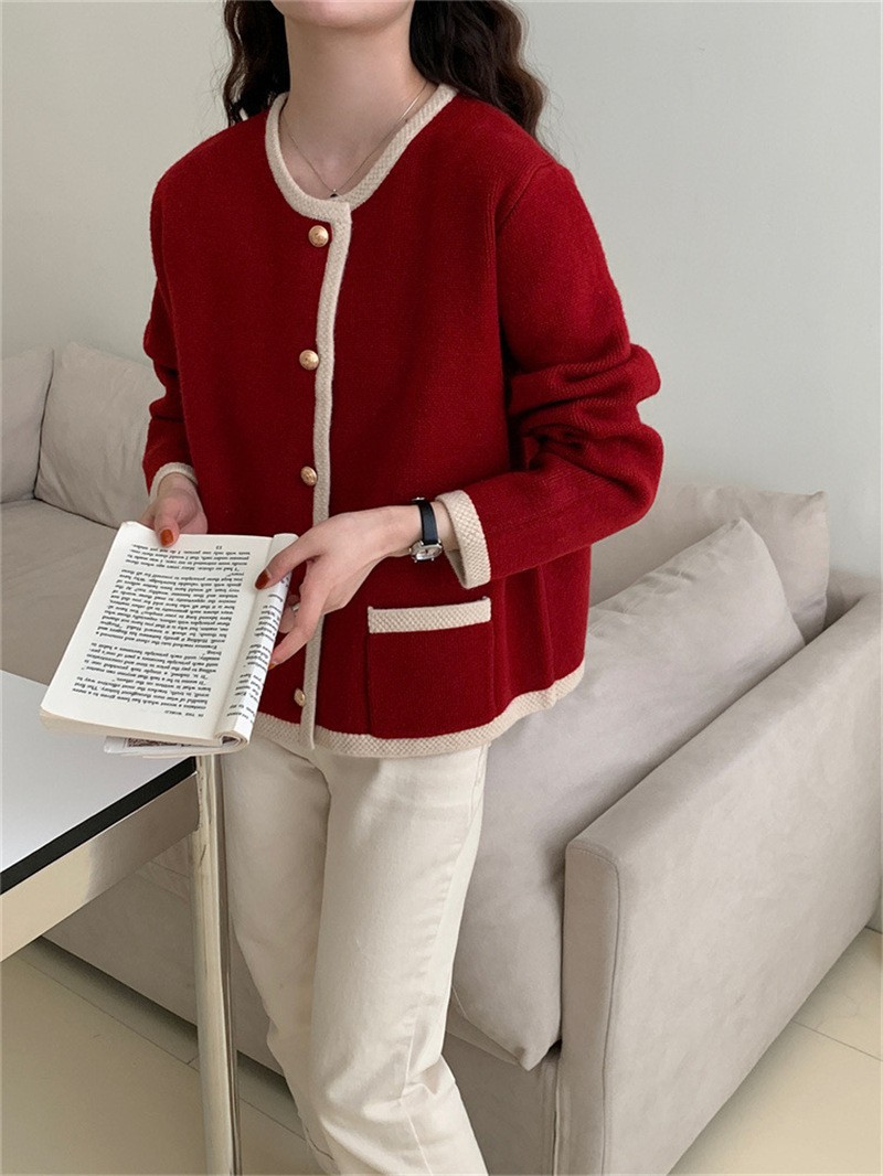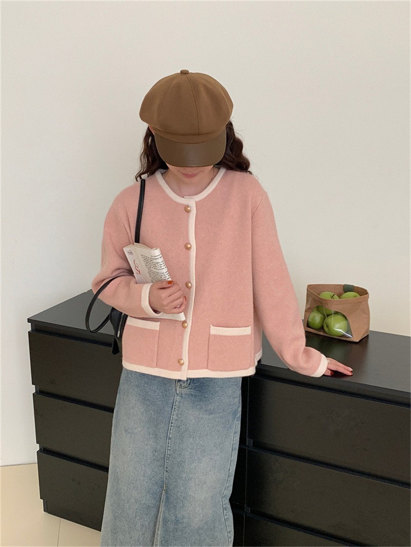 拼色圆领小香风针织开衫女秋冬新款韩版高级感休闲单排扣毛衣外套