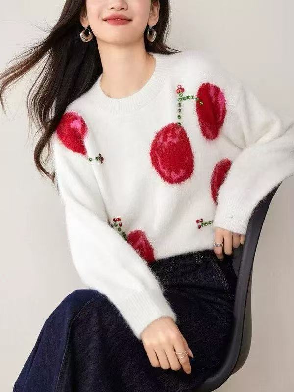 2025秋季女装慵懒宽松长毛高弹圆领套头毛衣上衣白色重工樱桃镶钻