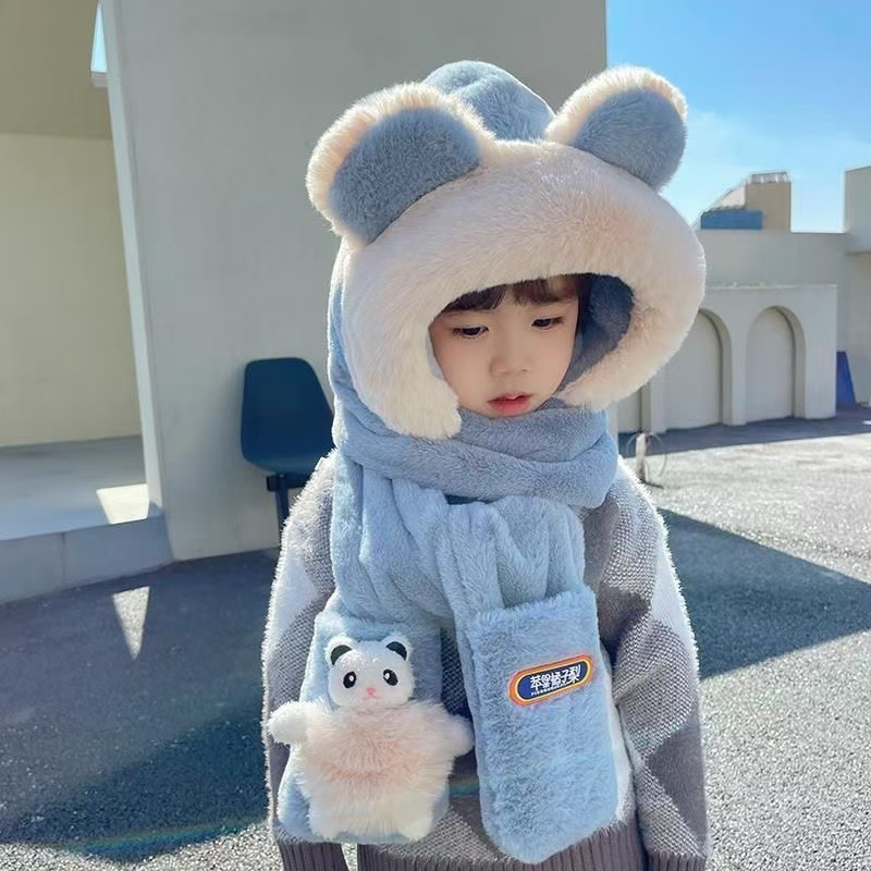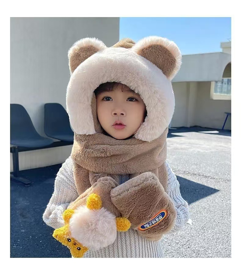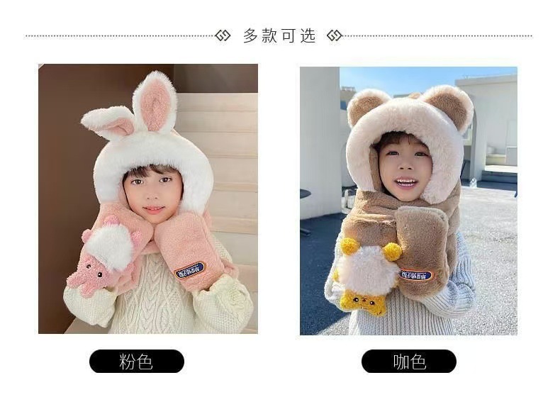 儿童帽子围巾手套一体三件套男童冬季保暖宝宝防风男孩女童毛绒帽