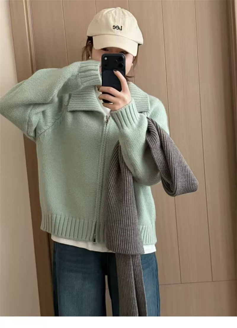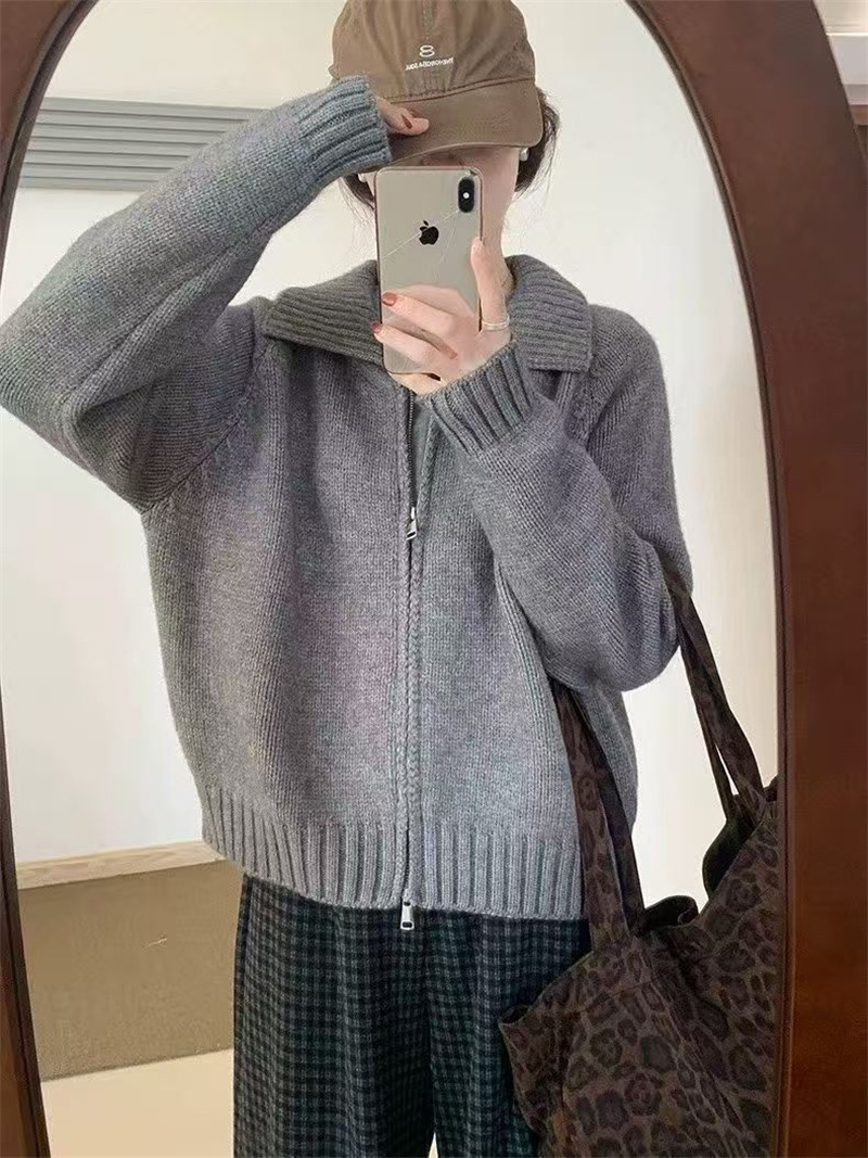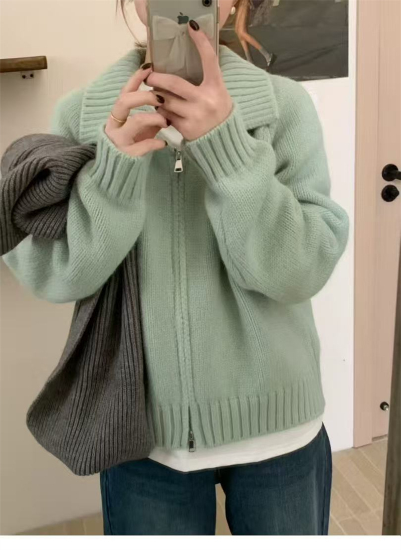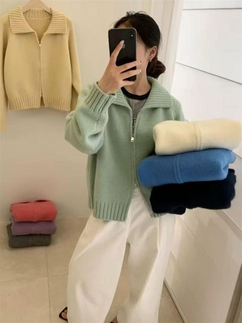 韩系慵懒风软糯翻领拉链毛衣外套女秋冬新款简约纯色长袖针织开衫