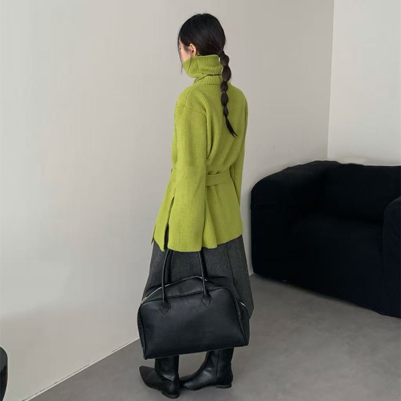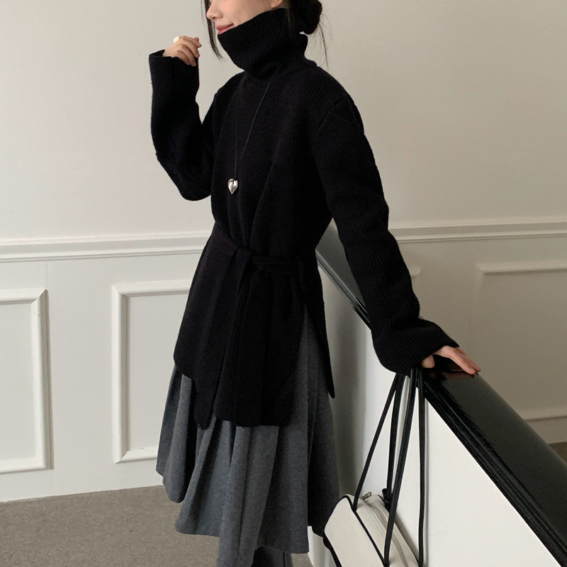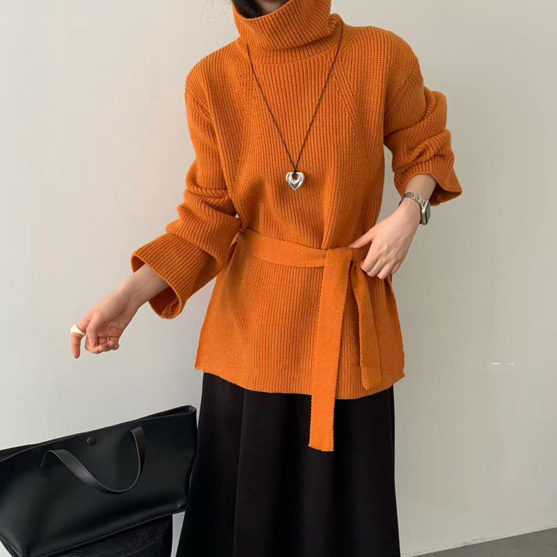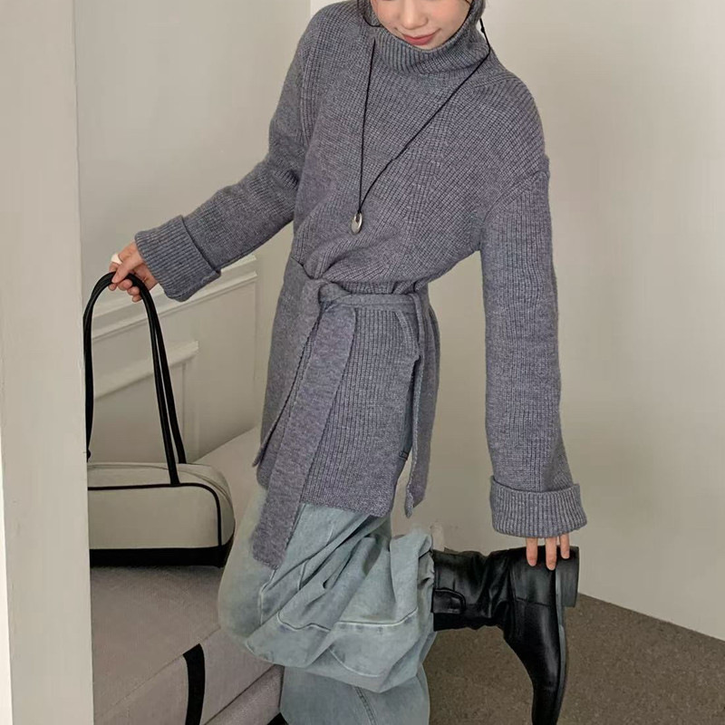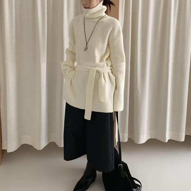 韩版设计感高领中长款套头针织衫女秋冬新款宽松收腰系带纯色毛衣