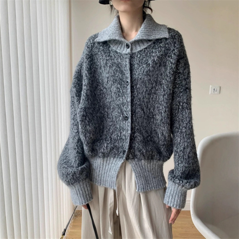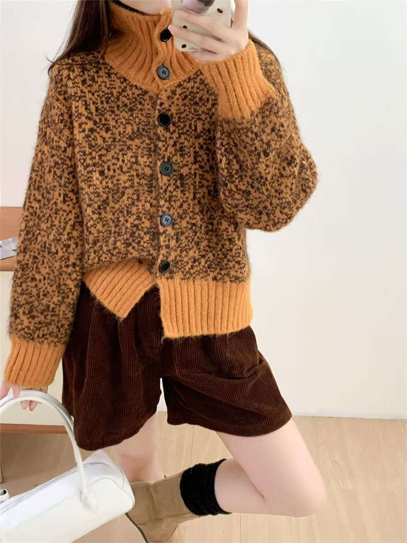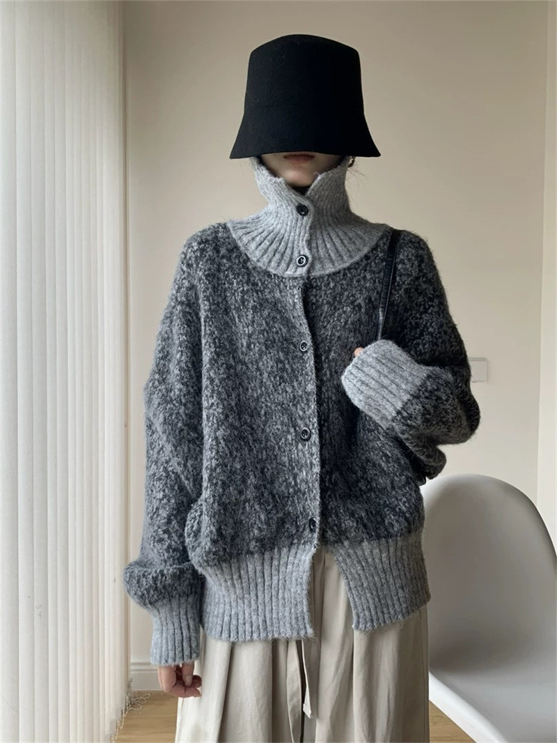 欧洲站秋冬新款设计感拼色高领针织开衫女软糯慵懒单排扣毛衣外套