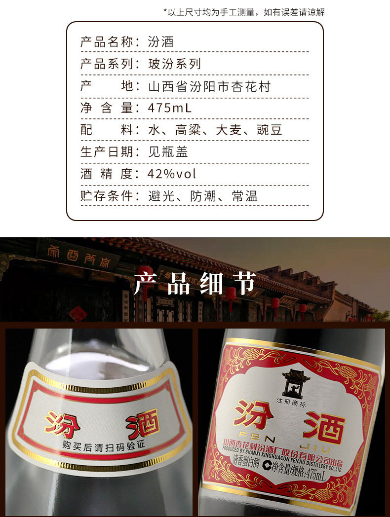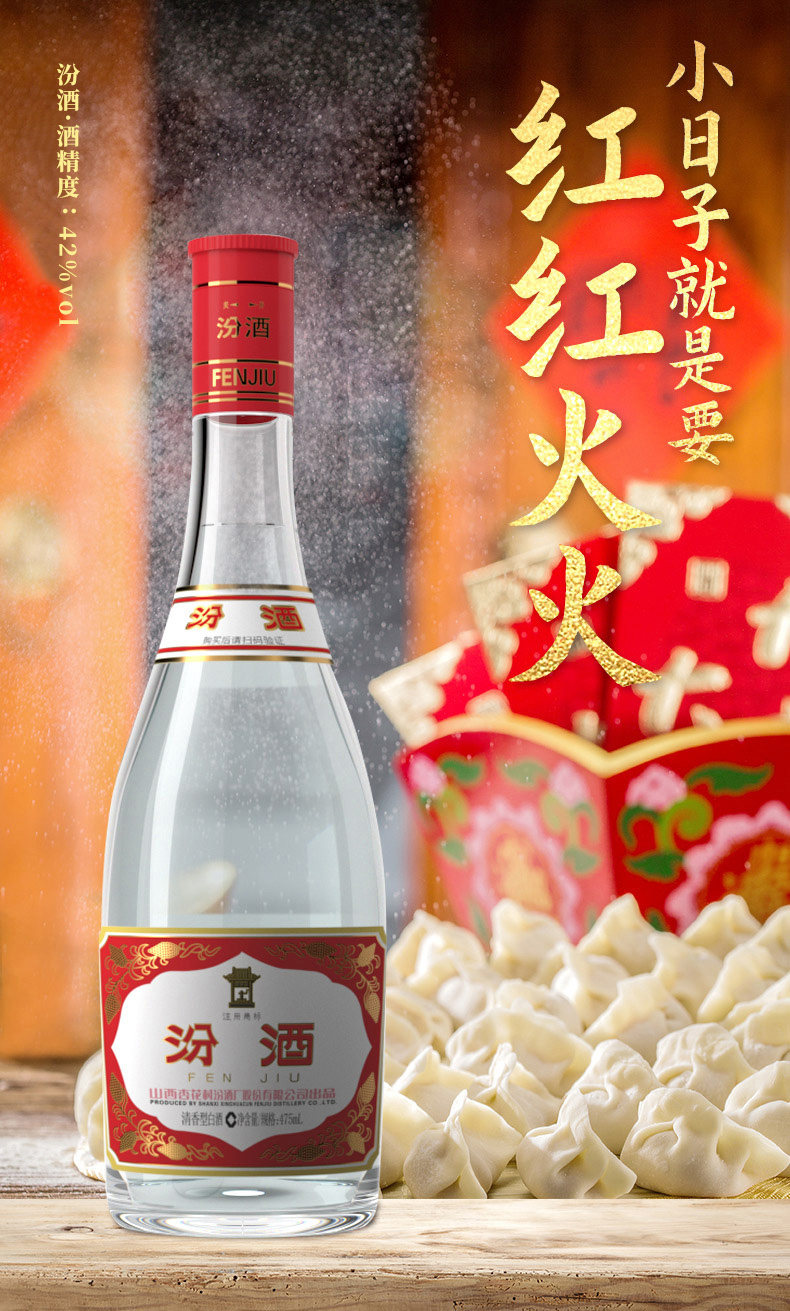 山西杏花村汾.酒42度红盖玻汾475ml6瓶清香型口粮酒-泡沫箱发包邮
