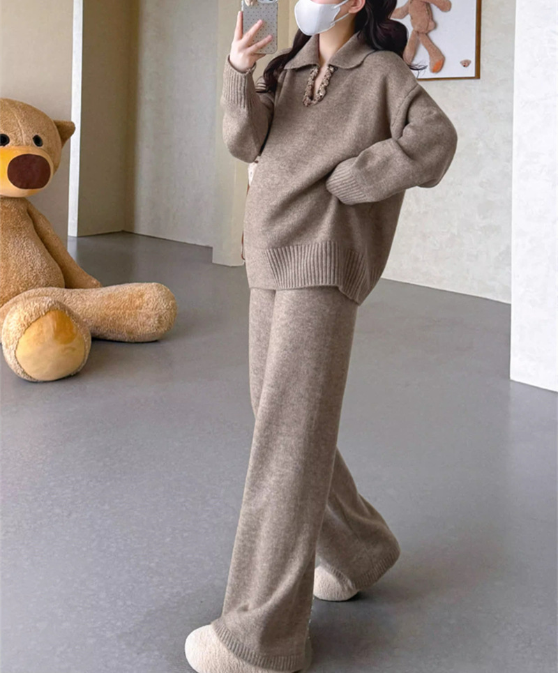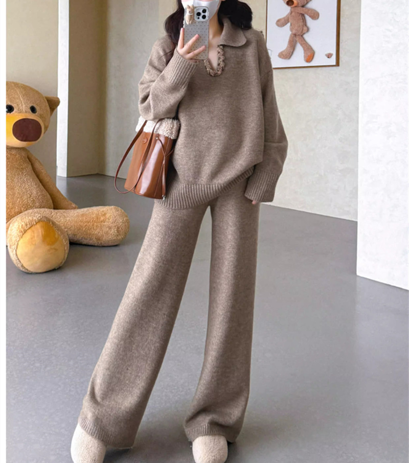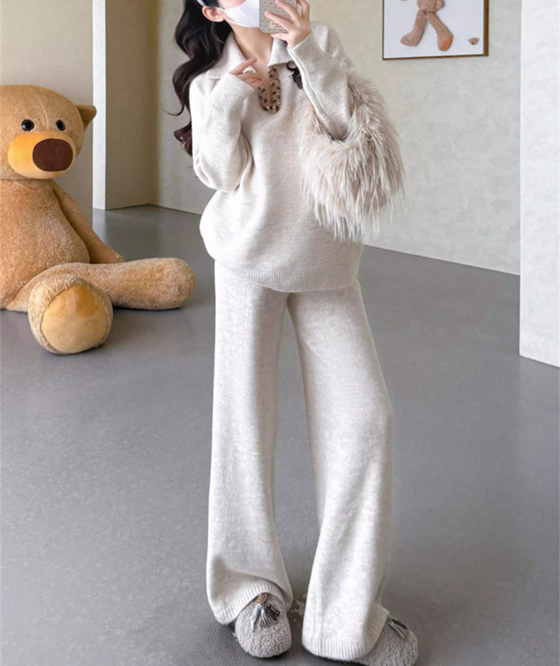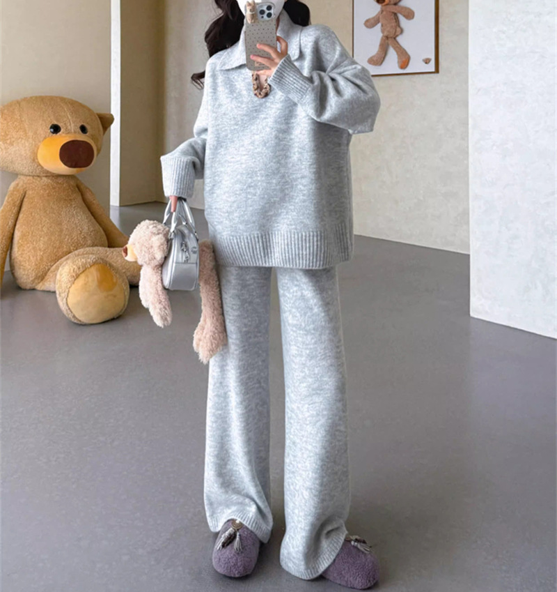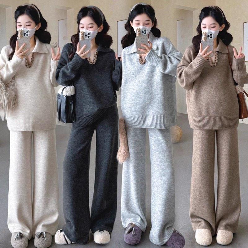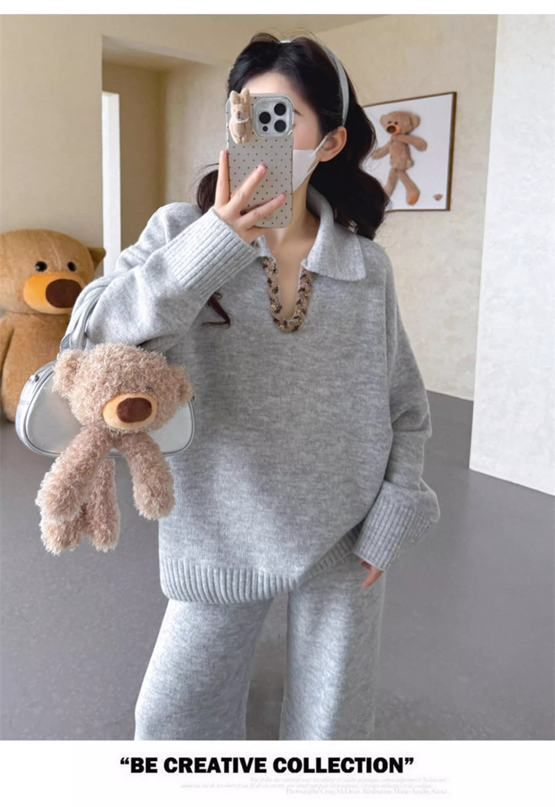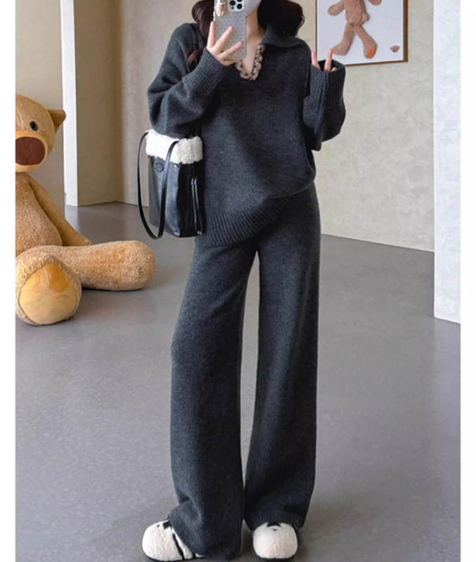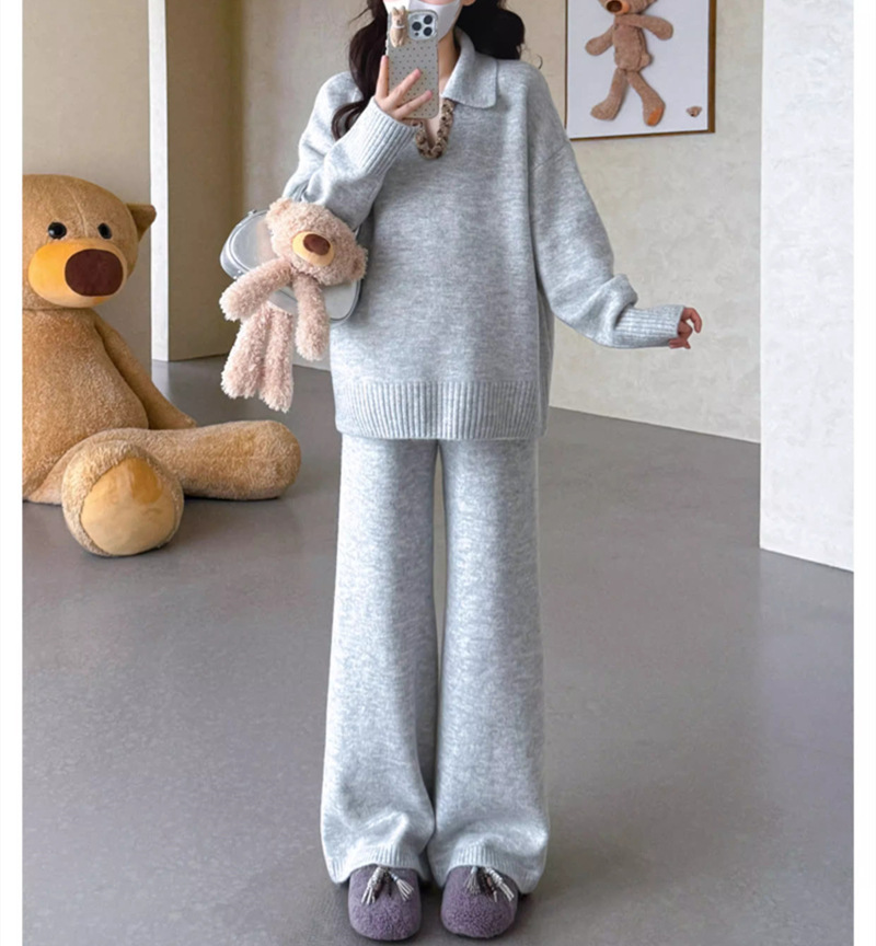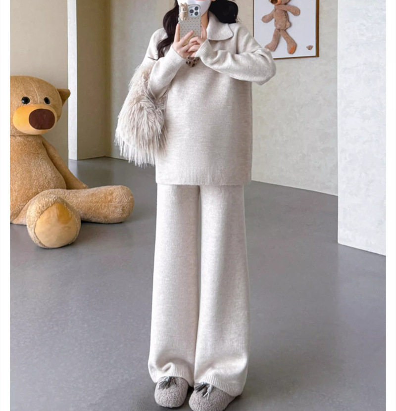 韩系慵懒风翻领针织毛衣高腰阔腿裤两件套女秋冬新款气质穿搭套装