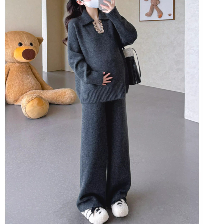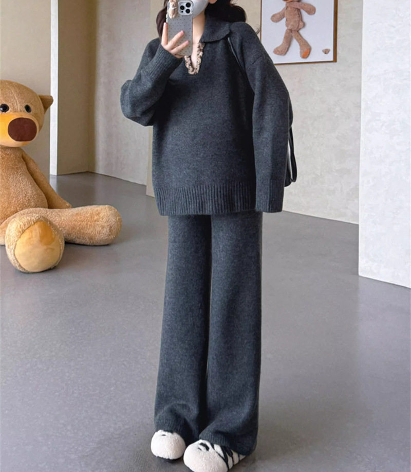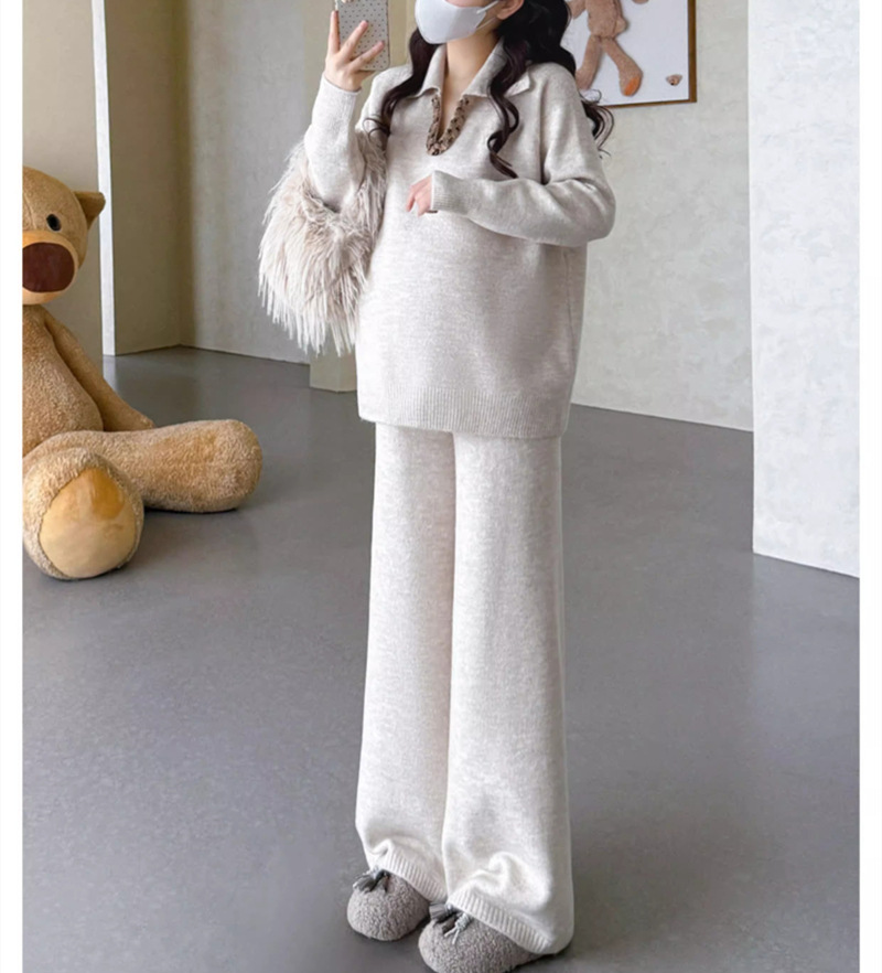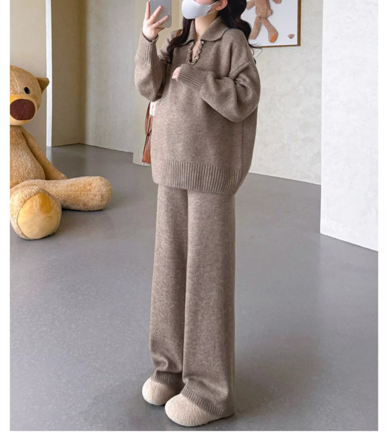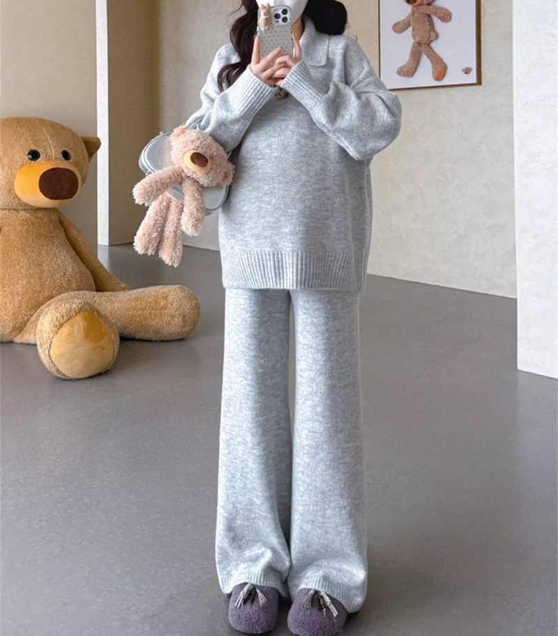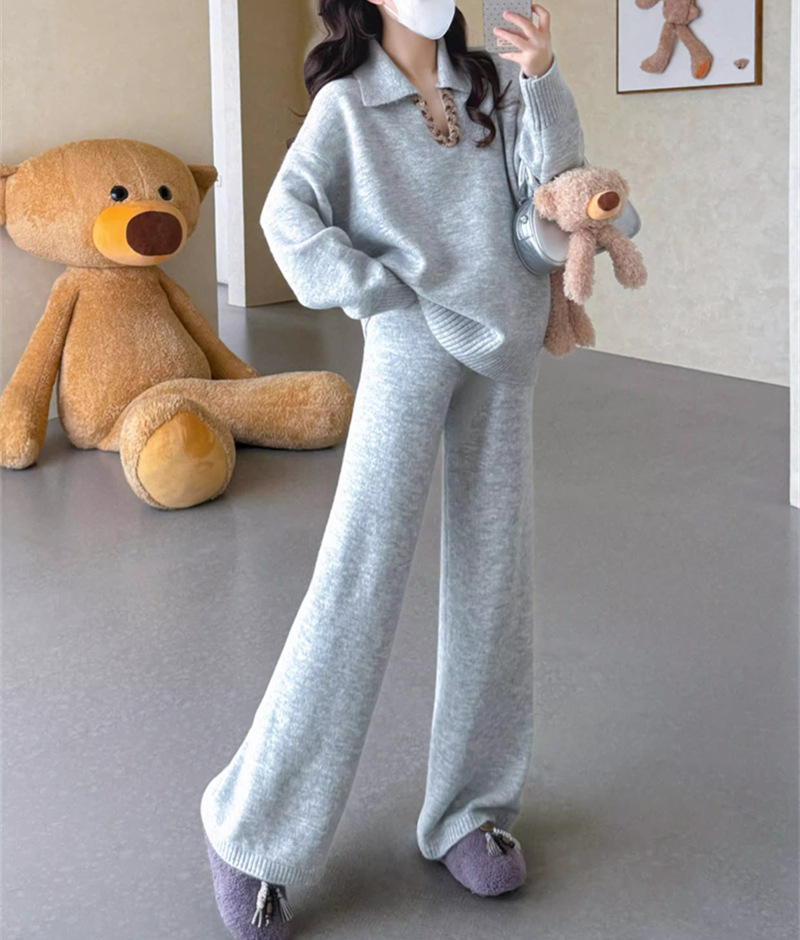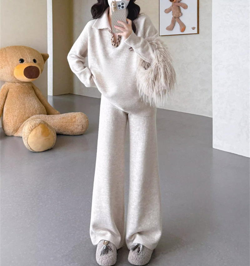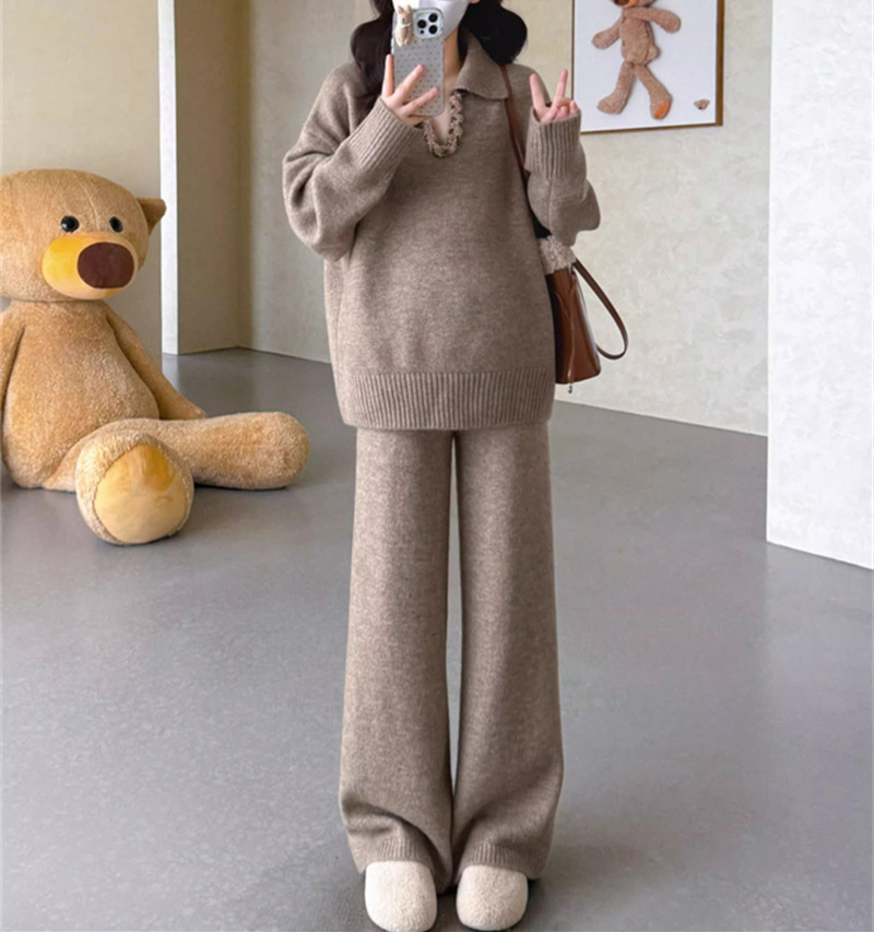 韩系慵懒风翻领针织毛衣高腰阔腿裤两件套女秋冬新款气质穿搭套装