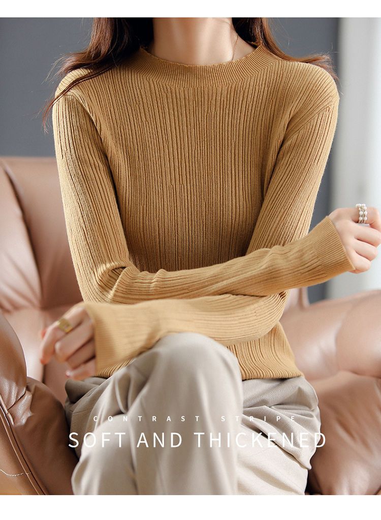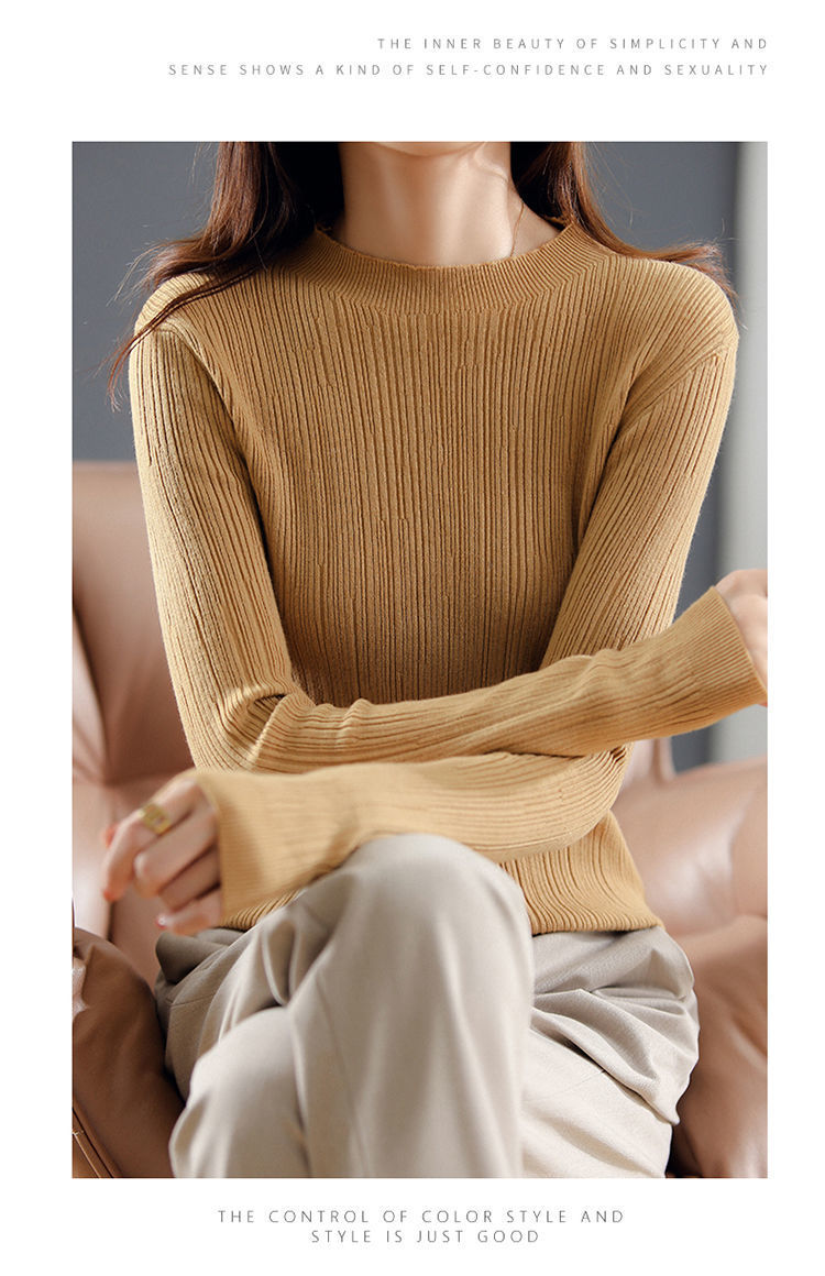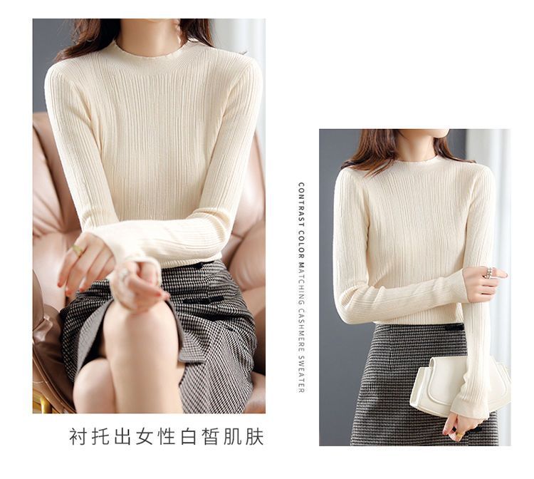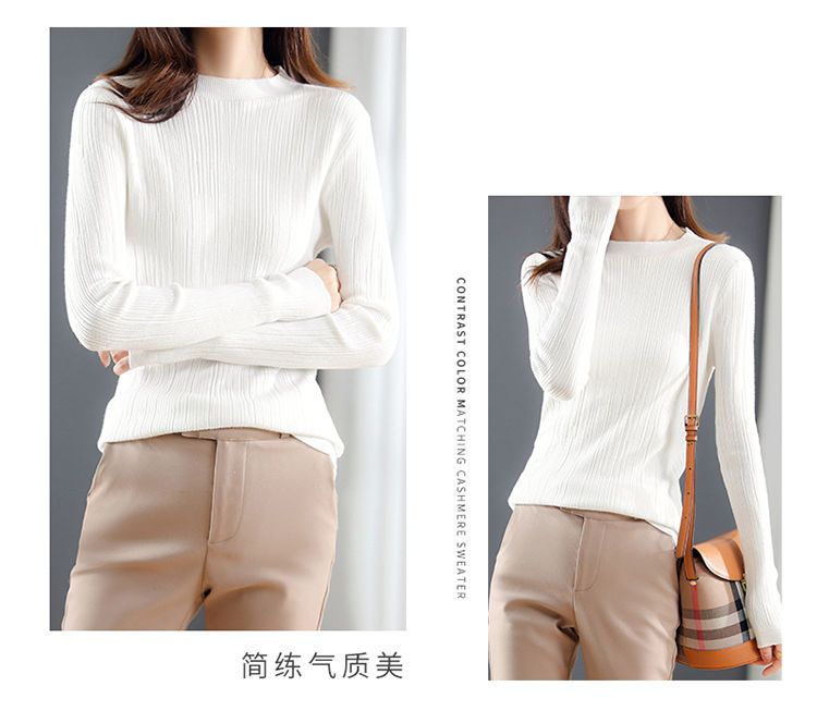 秋冬款苞芯纱羊毛混纺针织打底衫女款竖细纹圆领修身百搭长袖上衣