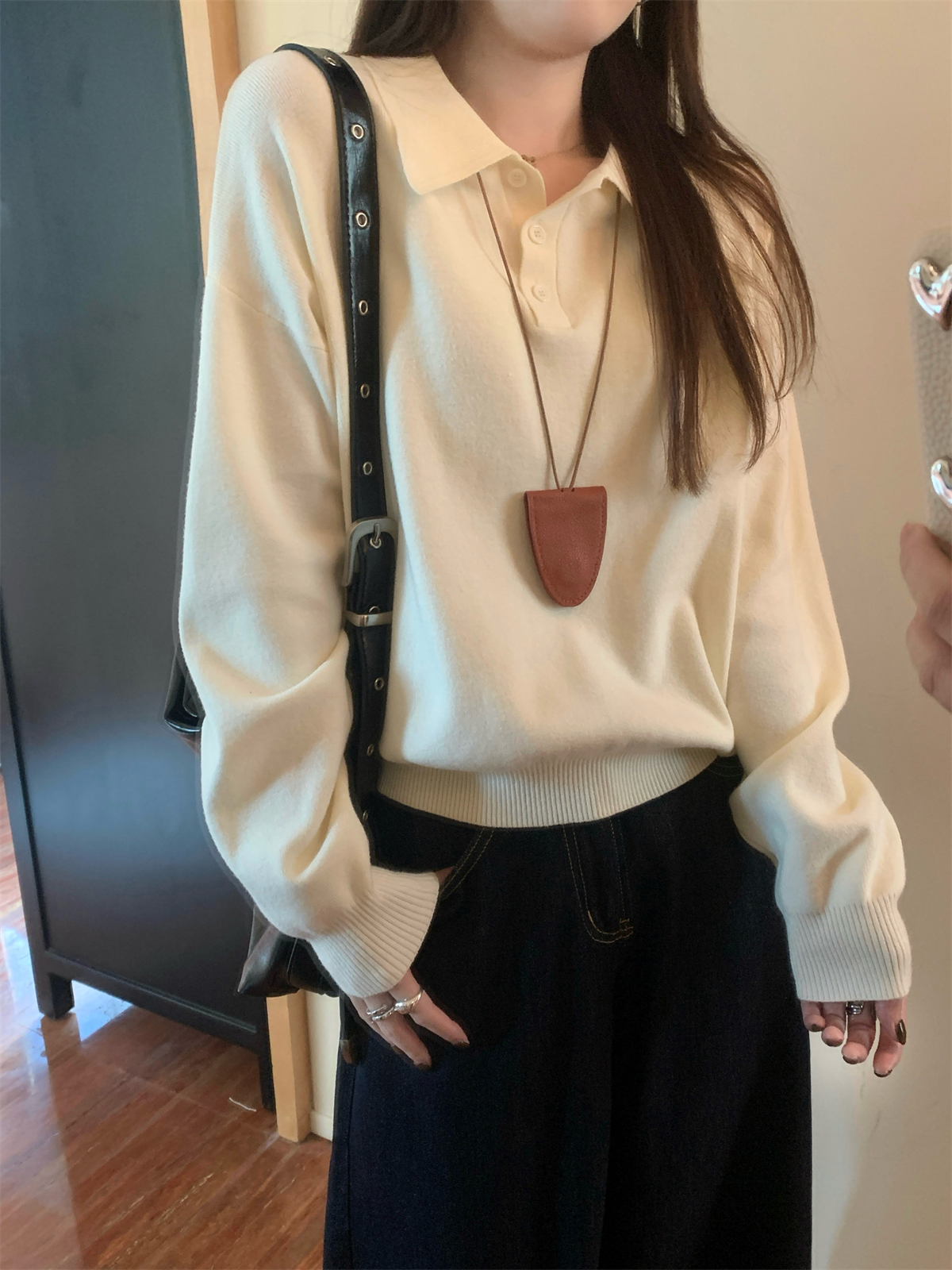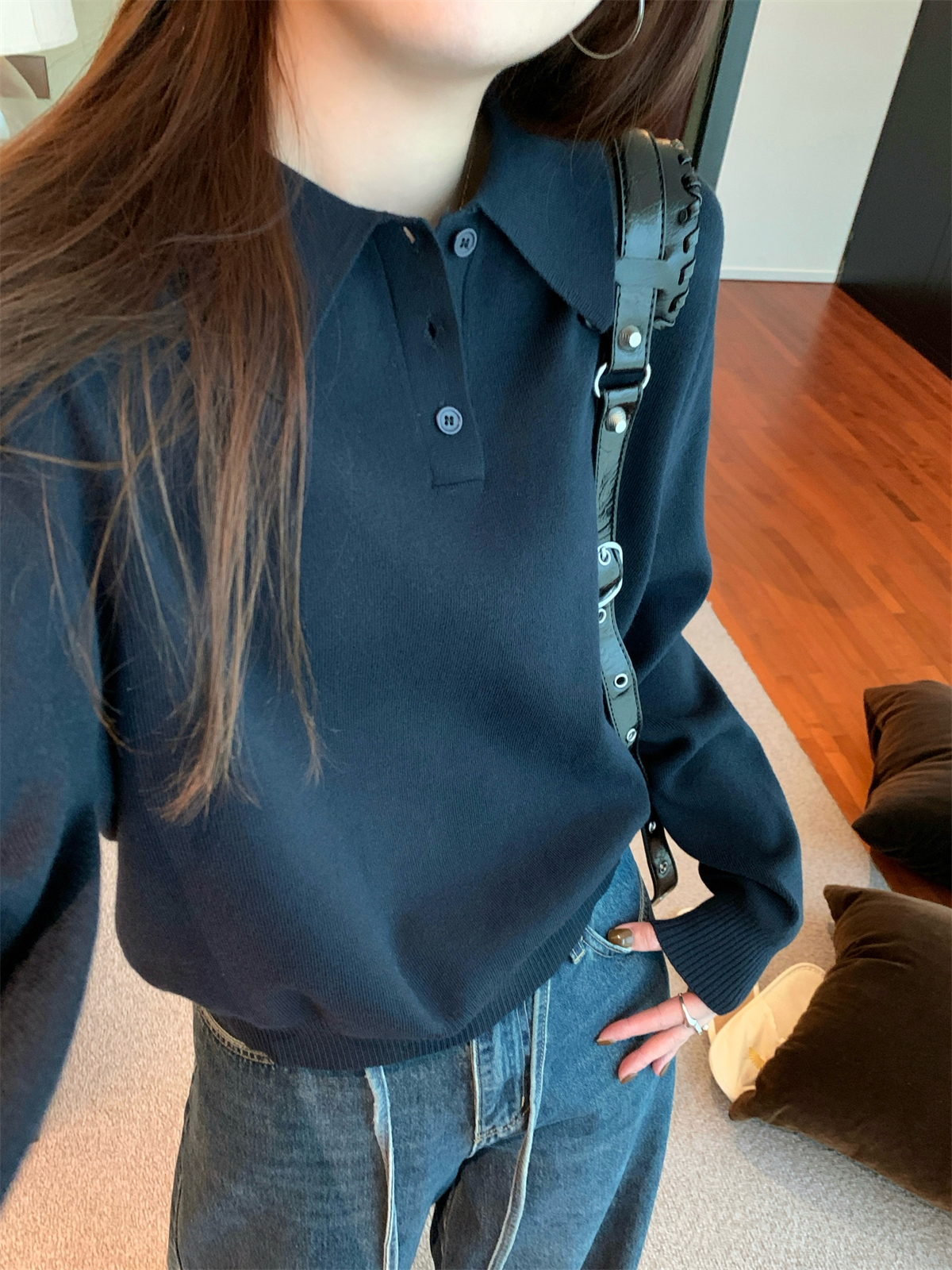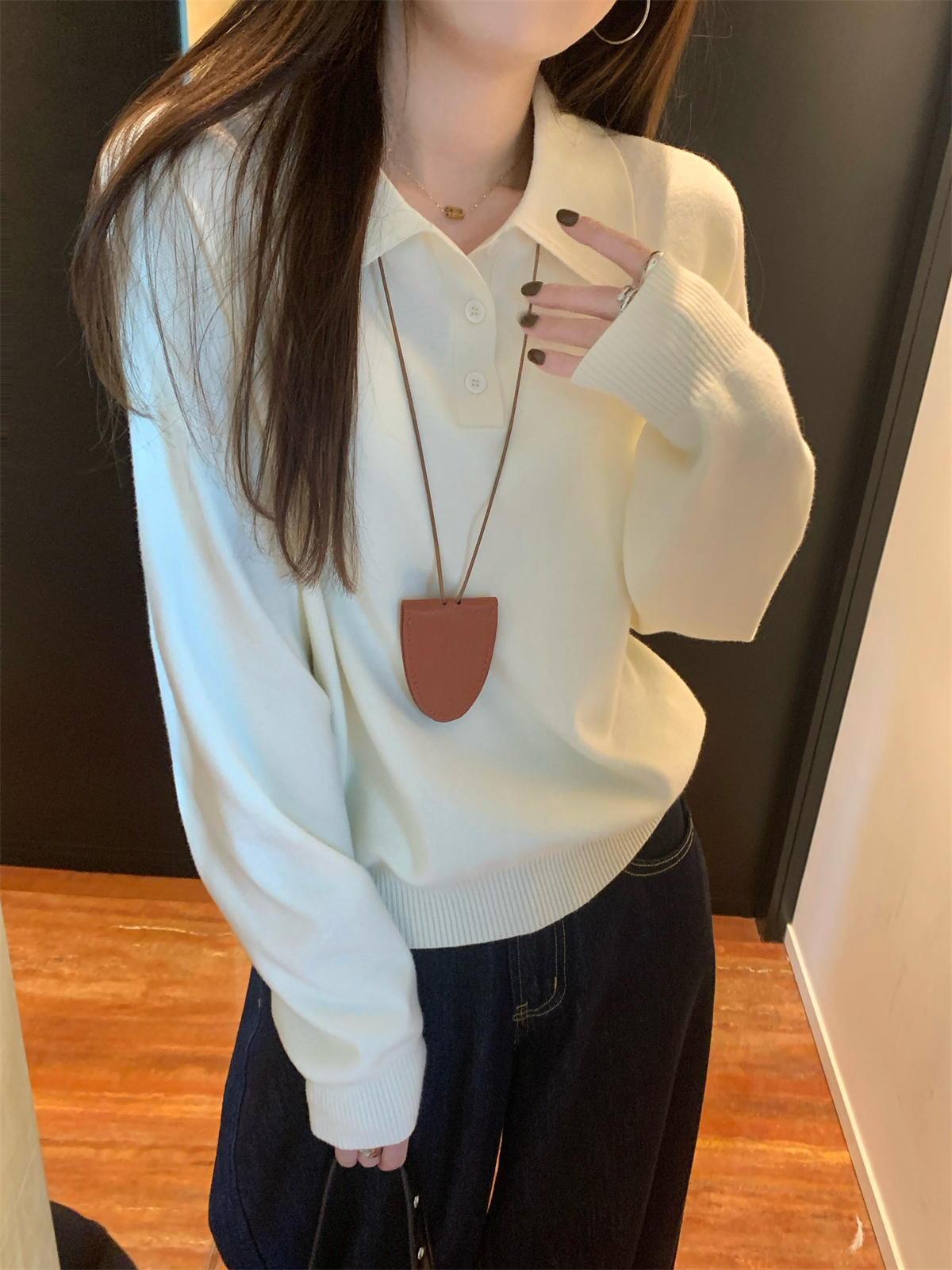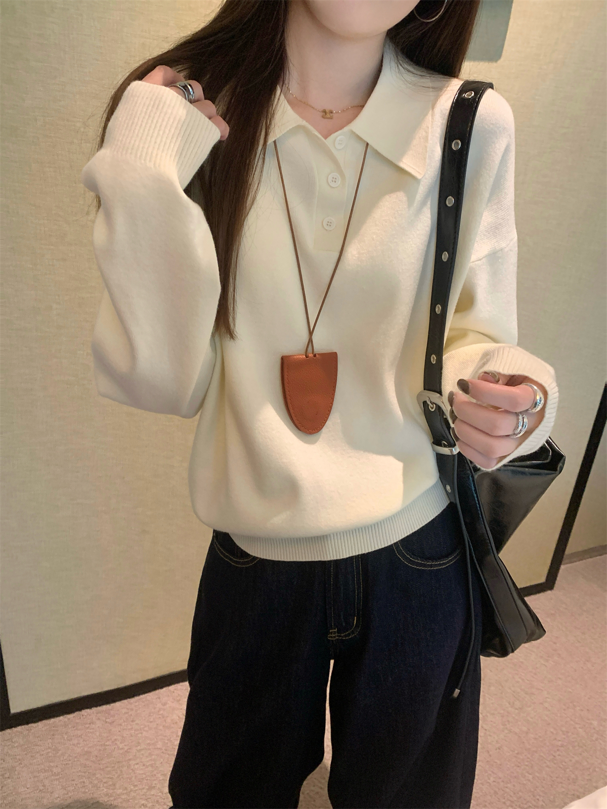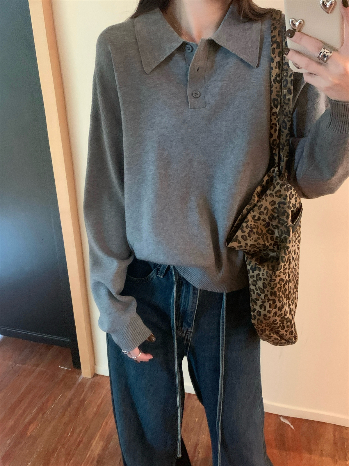 韩系polo领松弛感针织毛衣女春秋冬季简约慵懒打底衫宽松内搭衣