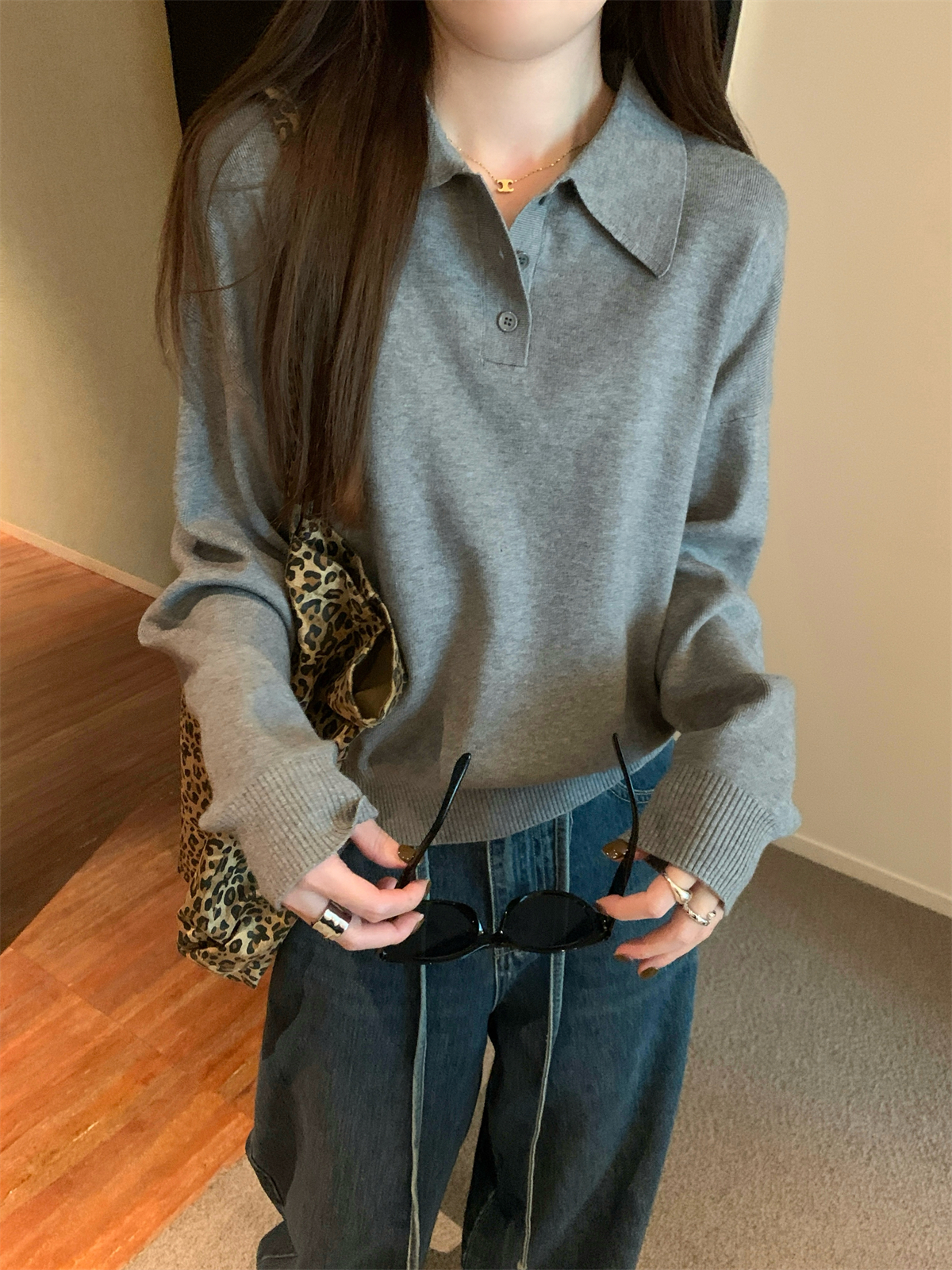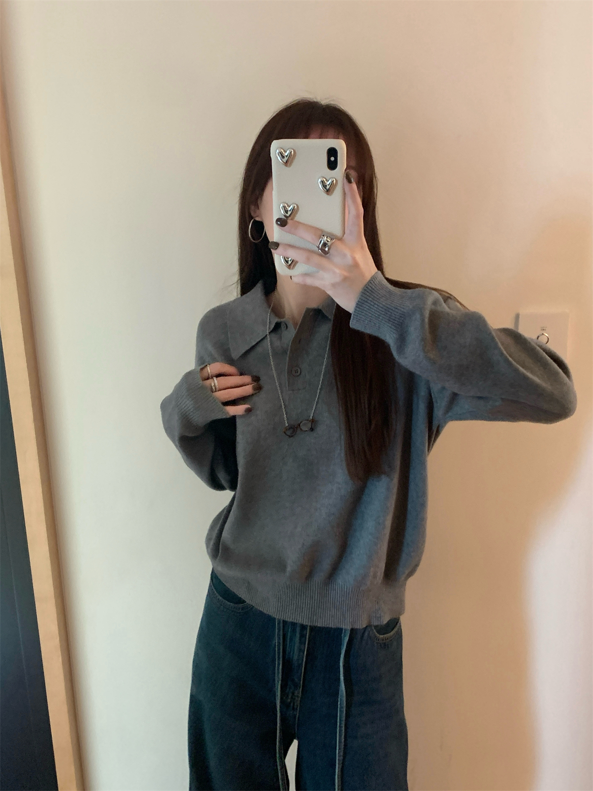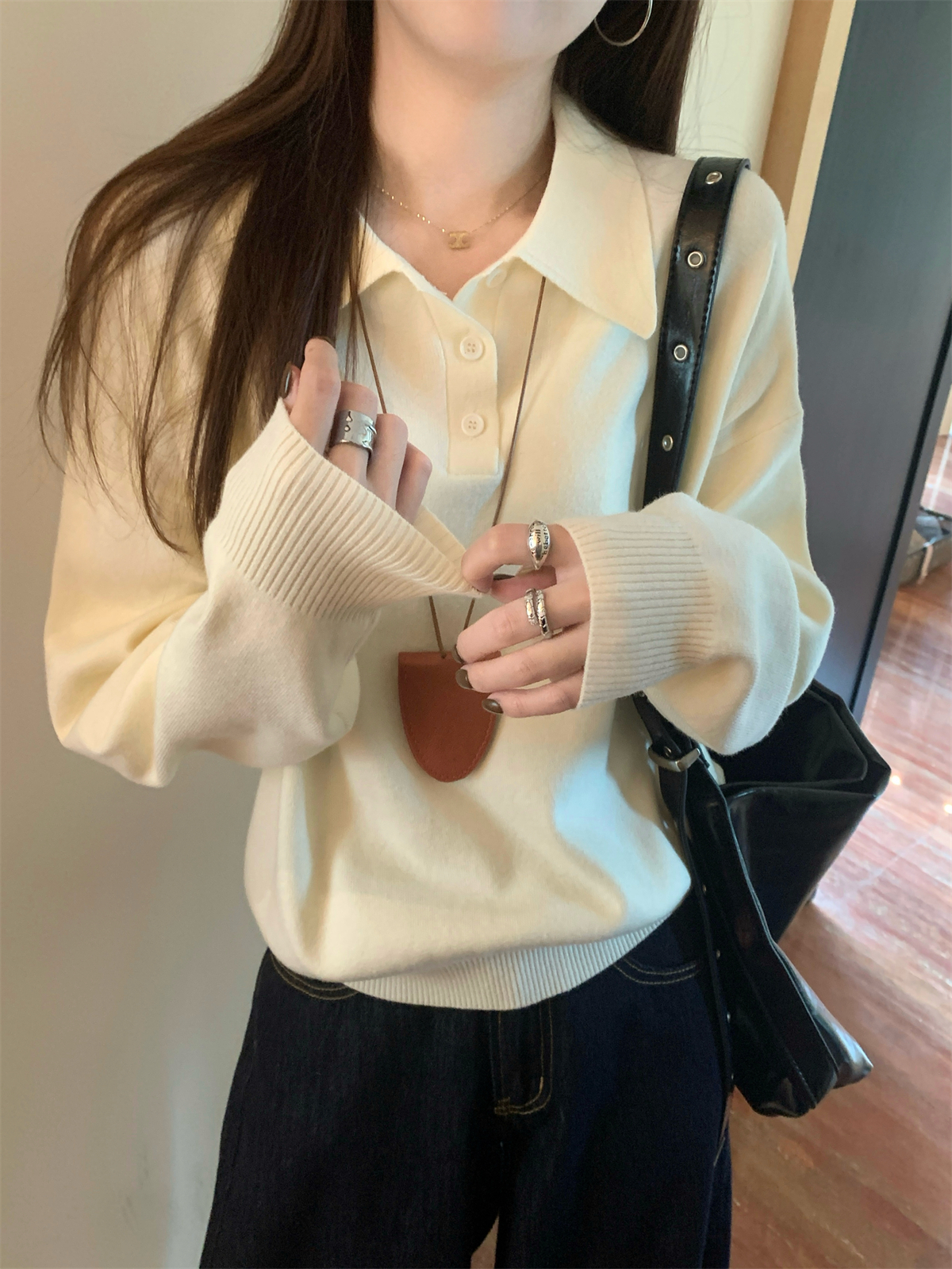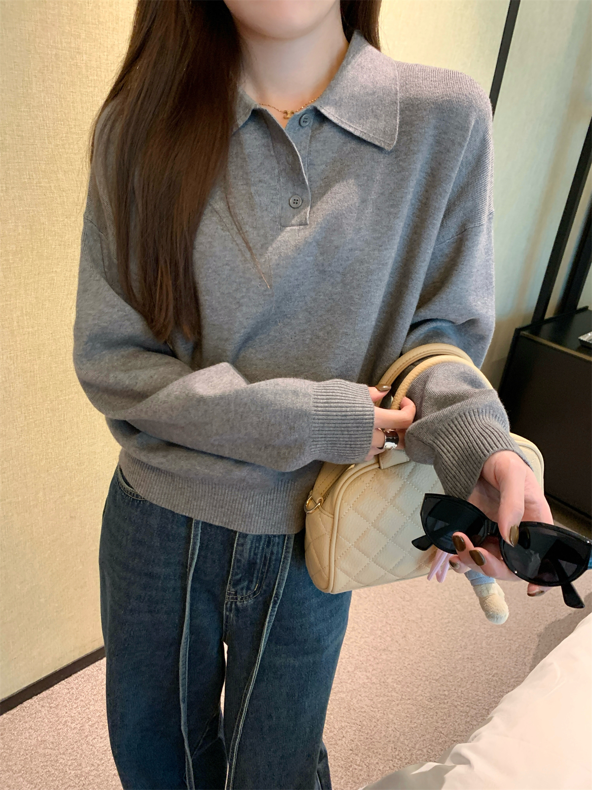 韩系polo领松弛感针织毛衣女春秋冬季简约慵懒打底衫宽松内搭衣