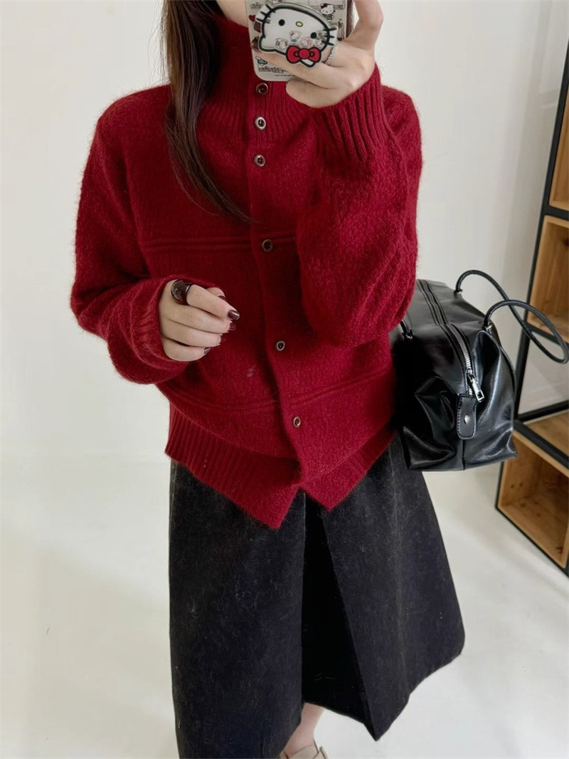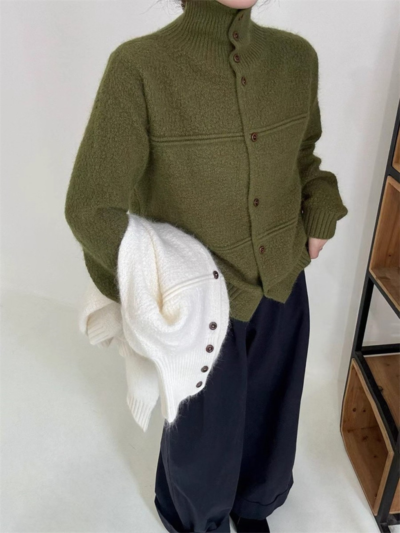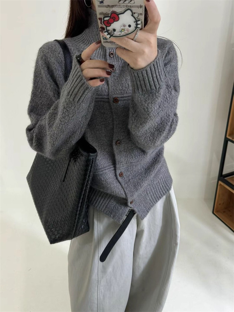韩版半高领单排扣针织开衫女秋冬新款洋气设计感软糯短款毛衣外套