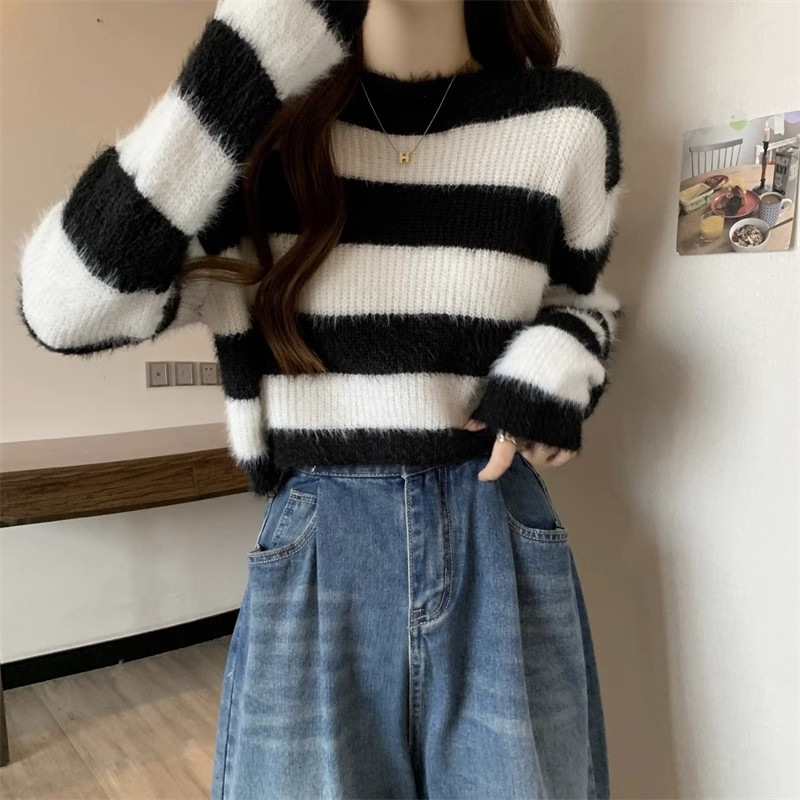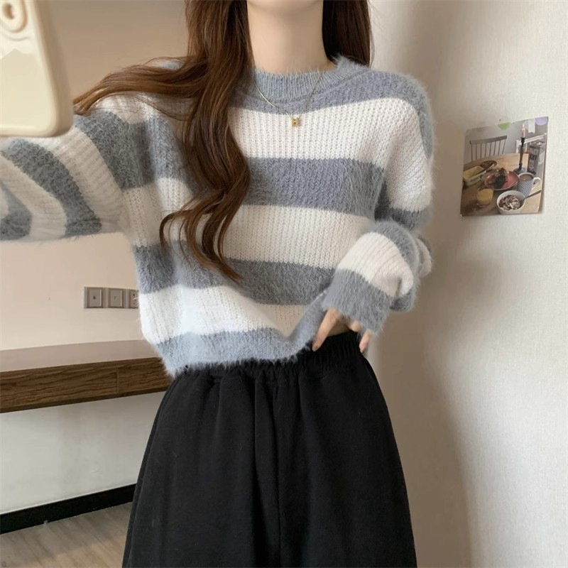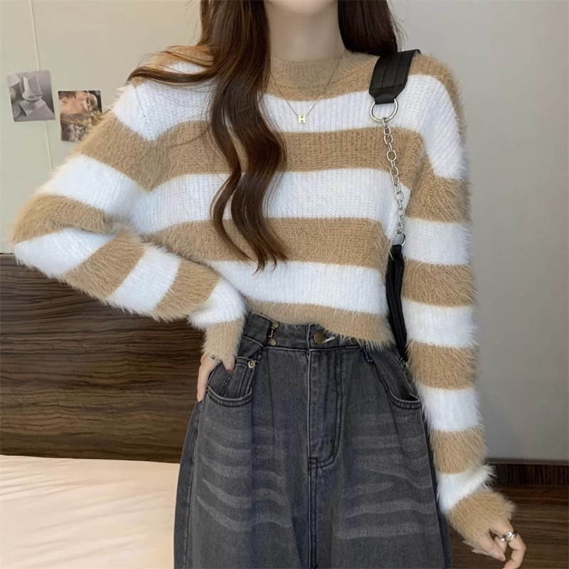 实拍~软糯水貂毛条纹毛衣女秋冬季圆领套头短款针织衫宽松上衣潮