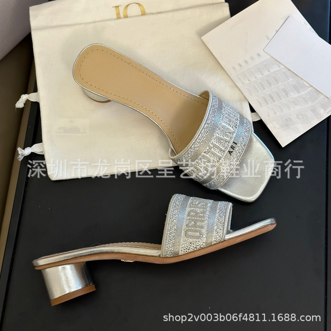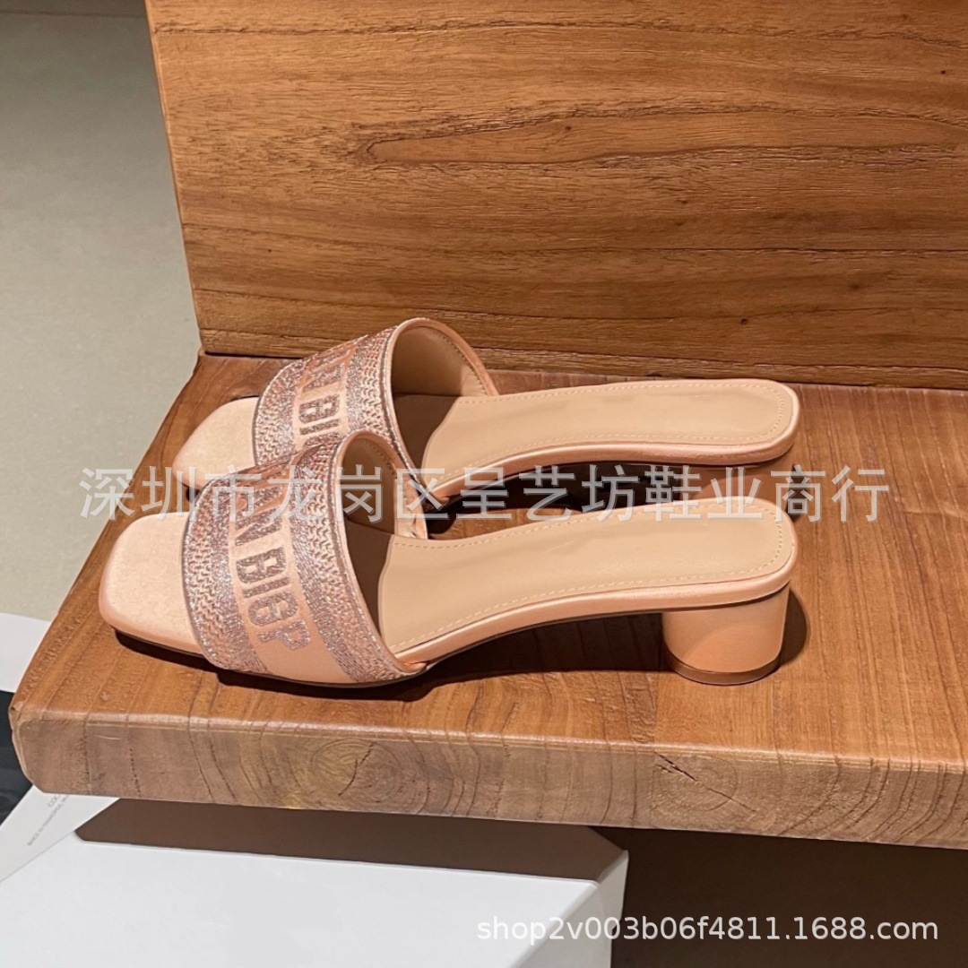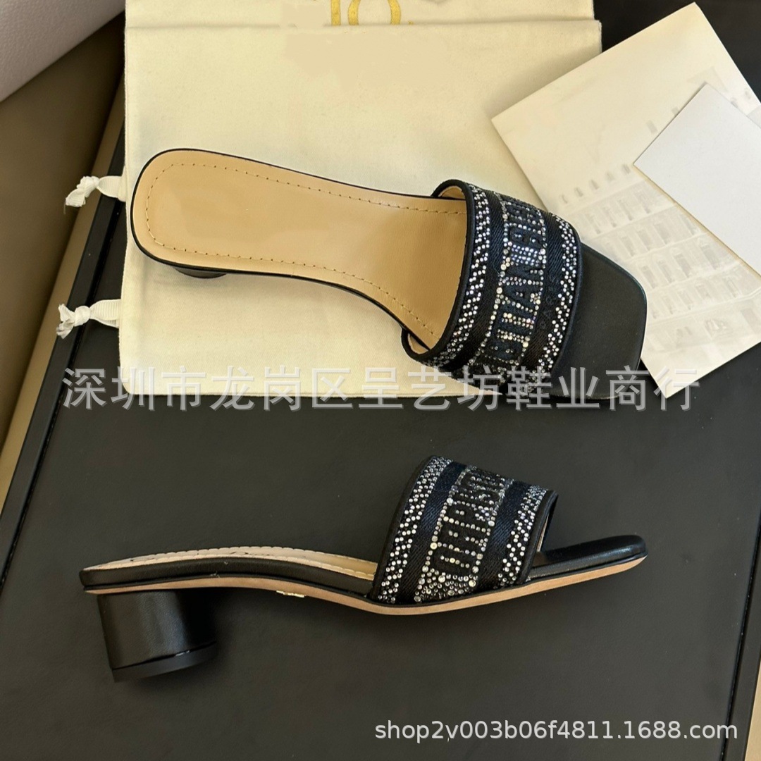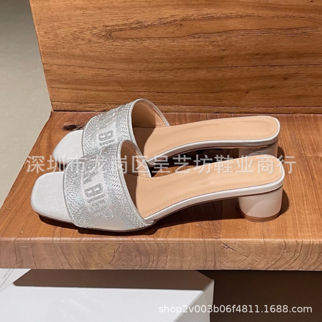 D家字母刺绣拖鞋女夏外穿水钻粗跟一字凉拖绸缎方头圆跟高跟凉鞋