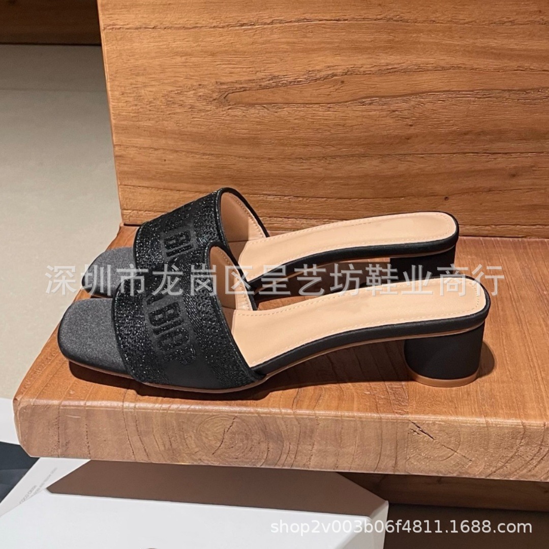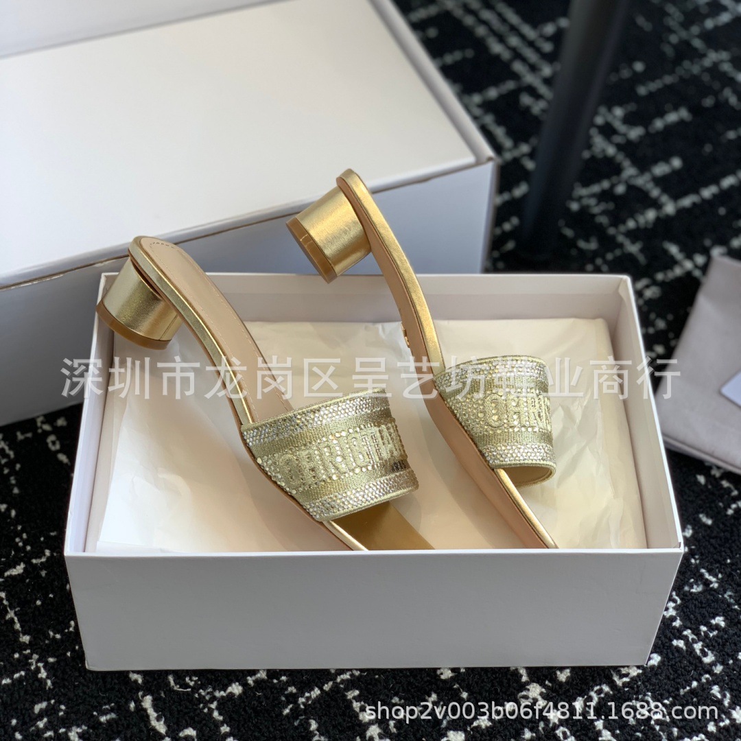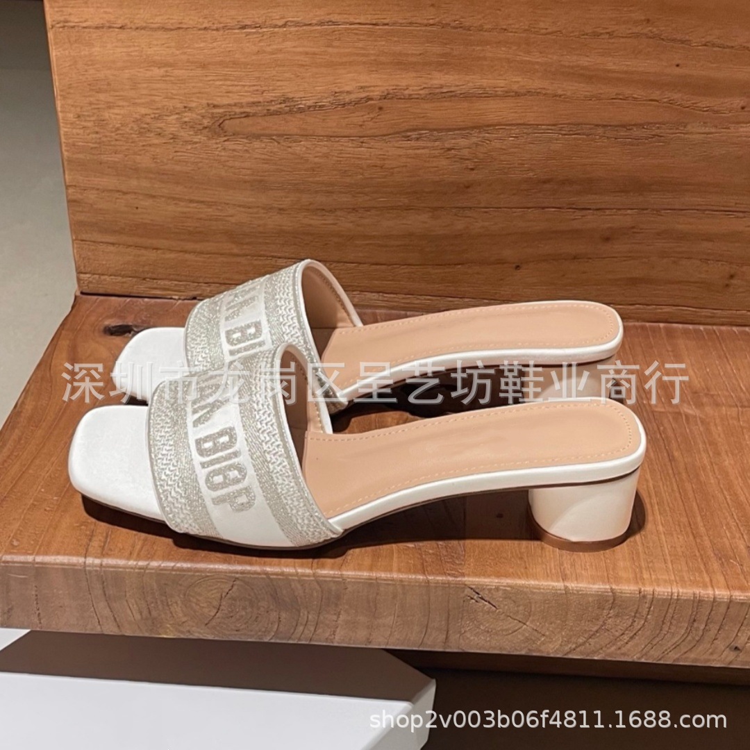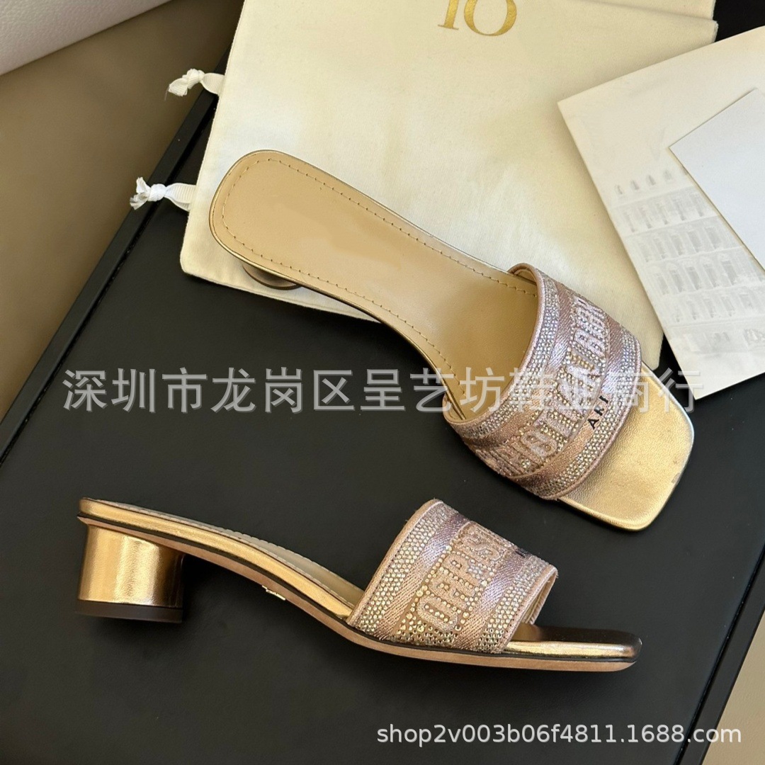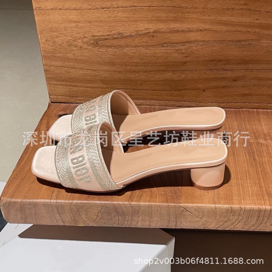 D家字母刺绣拖鞋女夏外穿水钻粗跟一字凉拖绸缎方头圆跟高跟凉鞋