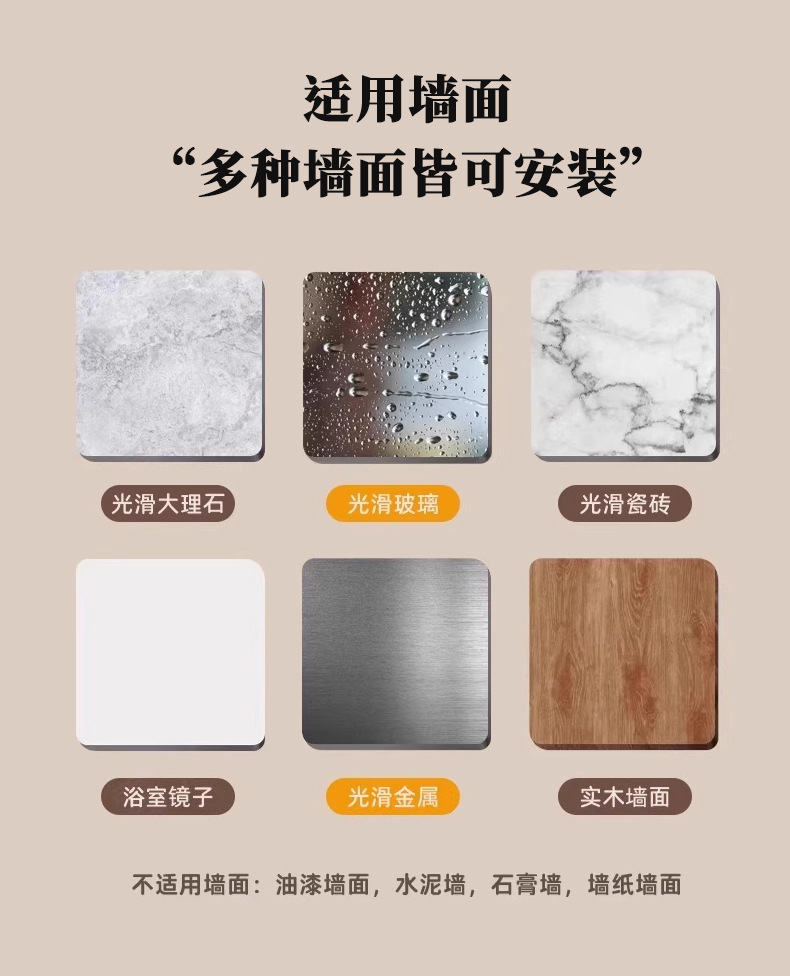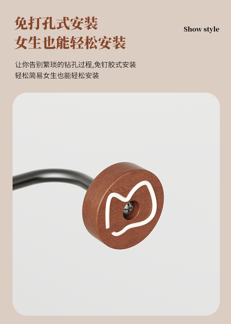 推荐理由:免打孔式安装,使用免钉胶,告别传统繁琐钻孔过程,极大程度保护墙面完整性,由源头工厂生产,具备价格优势。支持一件代发、免费贴标,还提供跨境外贸以及 OEM 贴牌定制服务,金属杆则坚固耐用,防水生锈发霉