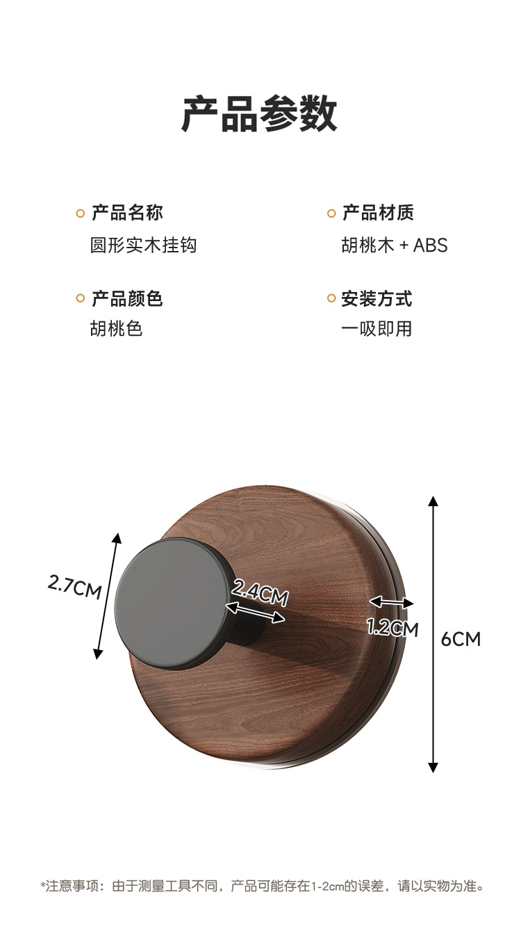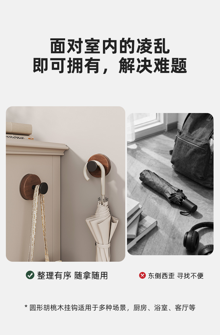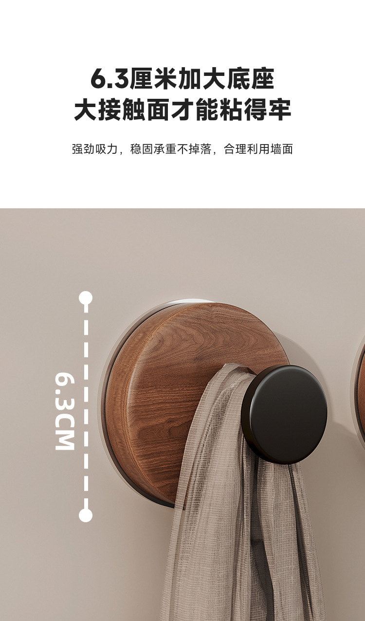 推荐理由:挂钩主体采用圆形原木材质,采用吸盘强力贴的安装方式,一吸即用,无需借助打孔工具和复杂的安装步骤,避免对墙面造成破坏。强劲吸附,稳固不移位,能够放心挂置物品,由源头工厂出品