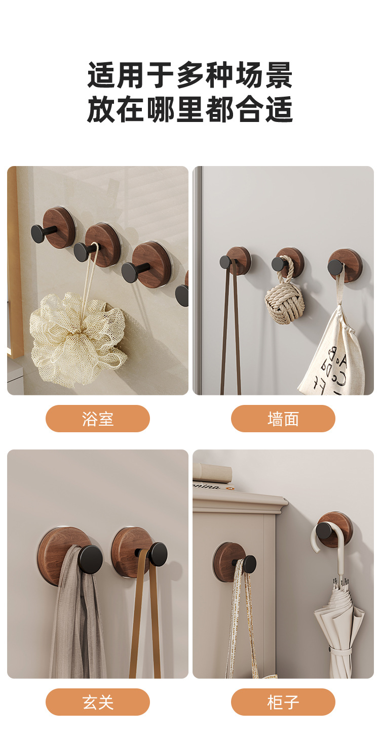 胡桃木吸盘免钉胶挂钩门后挂浴室衣钩高级壁挂强力承重粘钩无痕挂