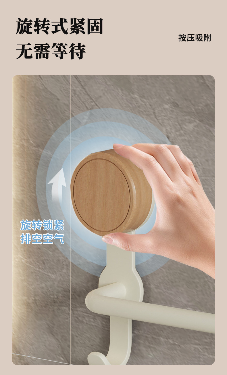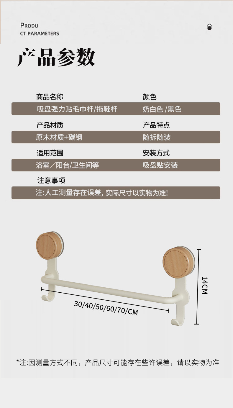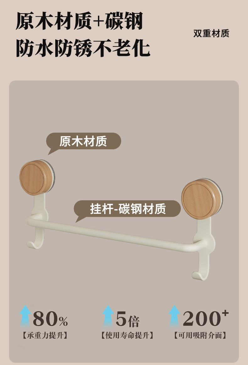优质原木卫生间毛巾拖鞋架免打孔吸盘强力粘毛巾浴巾挂杆带钩单杆