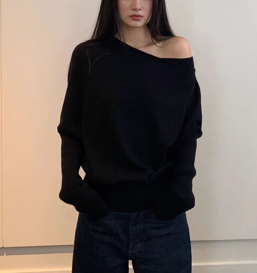 慵懒风一字领露肩山羊绒套头毛衣女设计感韩系宽松斜肩针织衫上衣,批发价,价格:65,厂家直销,慵懒风一字领露肩山羊绒套头毛衣女设计感韩系宽松斜肩针织衫上衣,免费拿样。